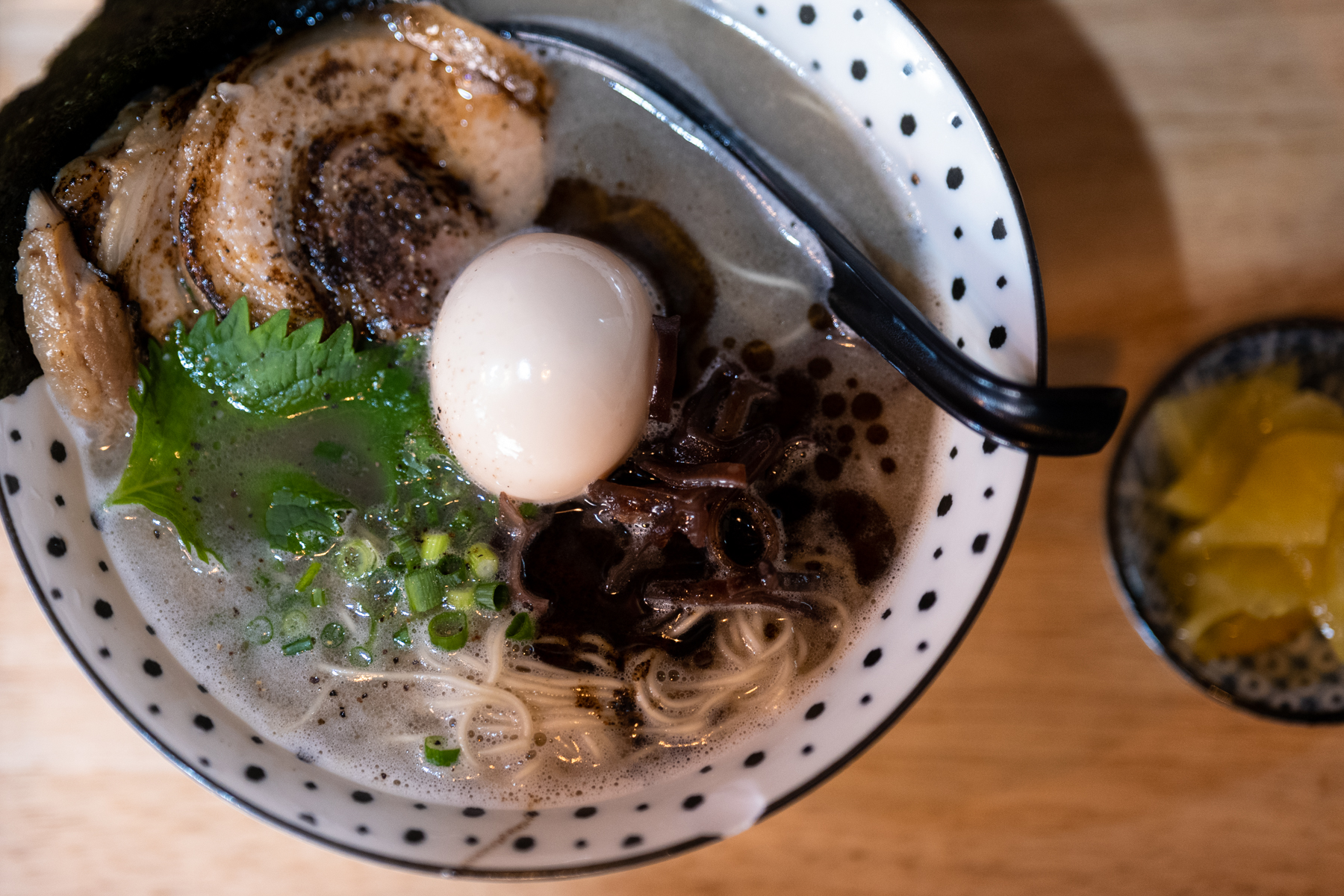 위 사진 속 메뉴는 쿠로 라멘입니다. 돈코츠 라멘에 간 마늘을 추가해서 먹는 취향이라 쿠로 라멘을 가장 기대했습니다. 메뉴 설명과 모양새에서 상상할 수 있듯, 진하고 약간은 쿰쿰한 돈코츠 육수에 간마늘의 알싸하고 끈끈한 향이 더해져 그야말로 입 안에 짝짝 붙는 라멘이었습니다. 돈코츠 육수와 마늘, 강한 두 향이 만났으니 저녁까지 향이 입 안에 맴돌 각오는 해야겠죠. 개인적으로는 너무 강+강 조합이라 첫 방문때 먹었던 기본 돈코츠 라멘 시로가 더 좋았습니다.