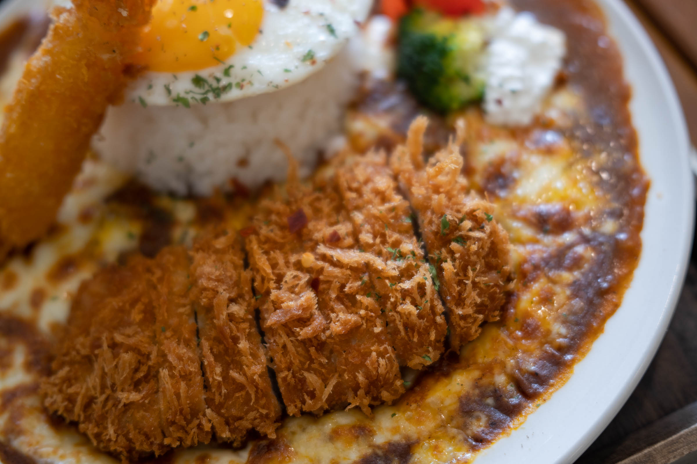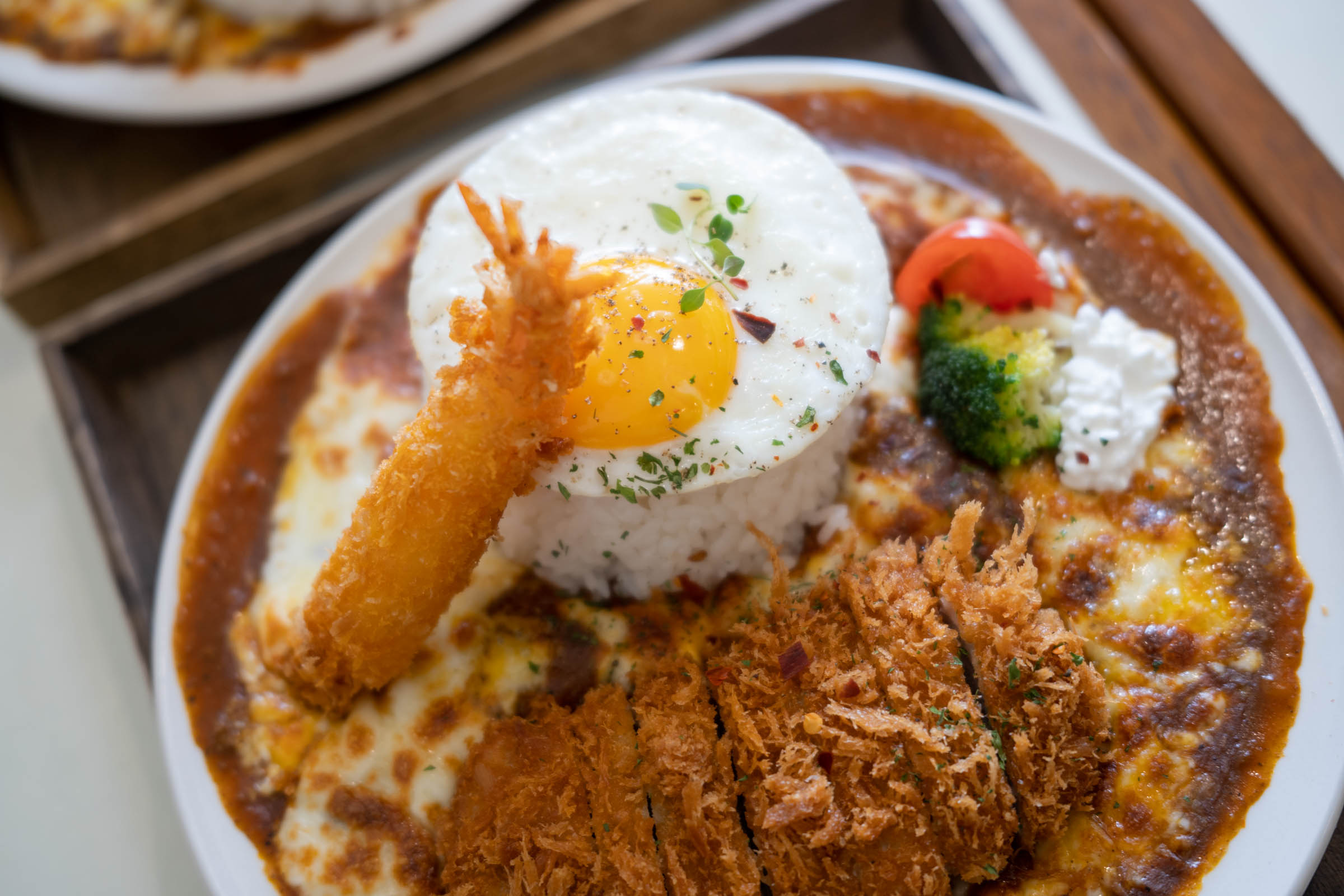푸짐한 한 접시가 나왔습니다. 야끼 카레에 돈카츠와 새우카츠가 올라간 메뉴입니다. 야끼 카레와 일반 카레의 차이는 치즈를 올려 토치로 치즈를 익힌 것 같습니다. 일반 카레에 비해 좀 더 기교를 부린 메뉴가 되겠네요. 카레 본래의 맛을 좋아하시면 일반 카레, 치즈 풍미와 은은한 불 향(?)이 궁금하시면 야끼 카레가 좋겠어요.