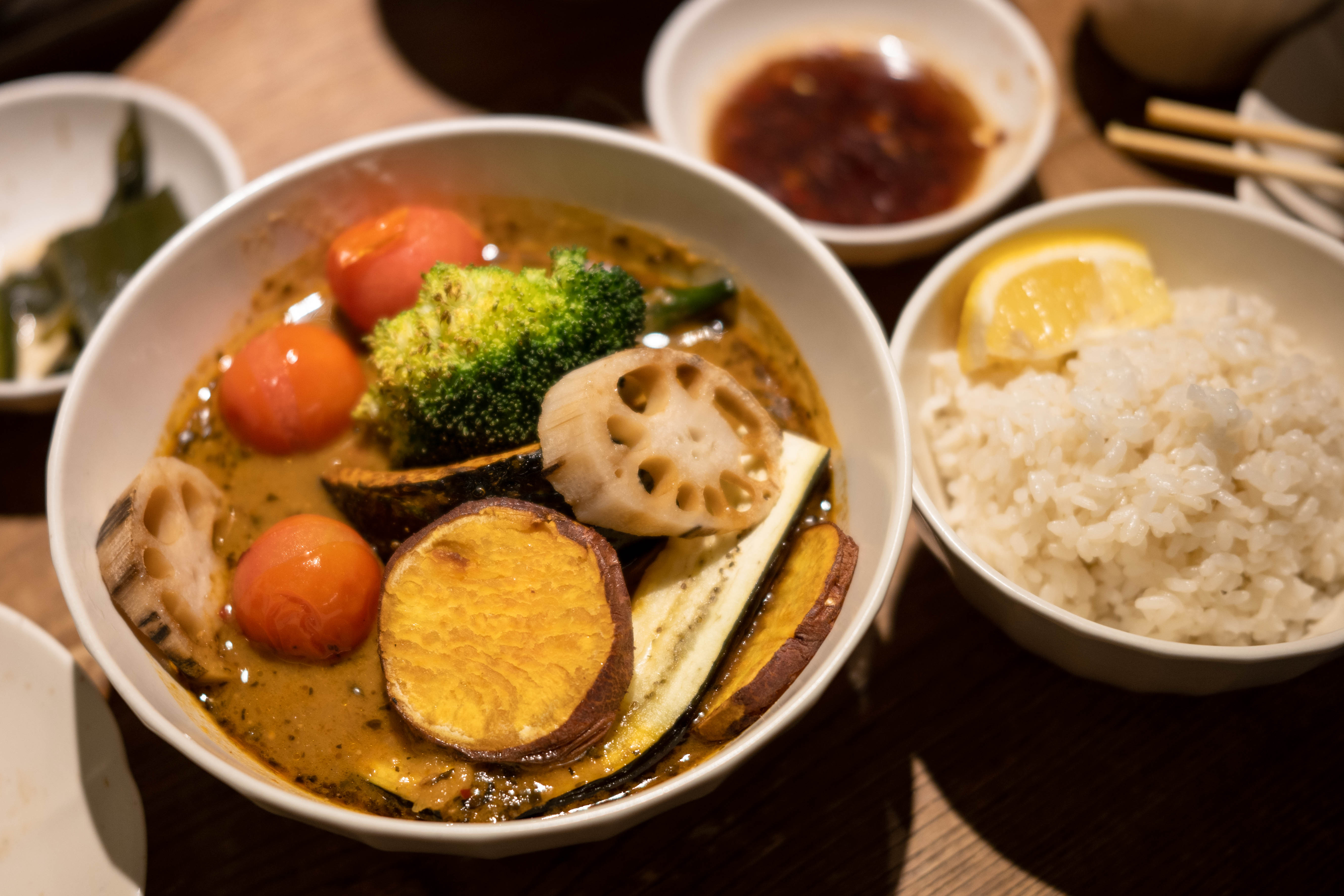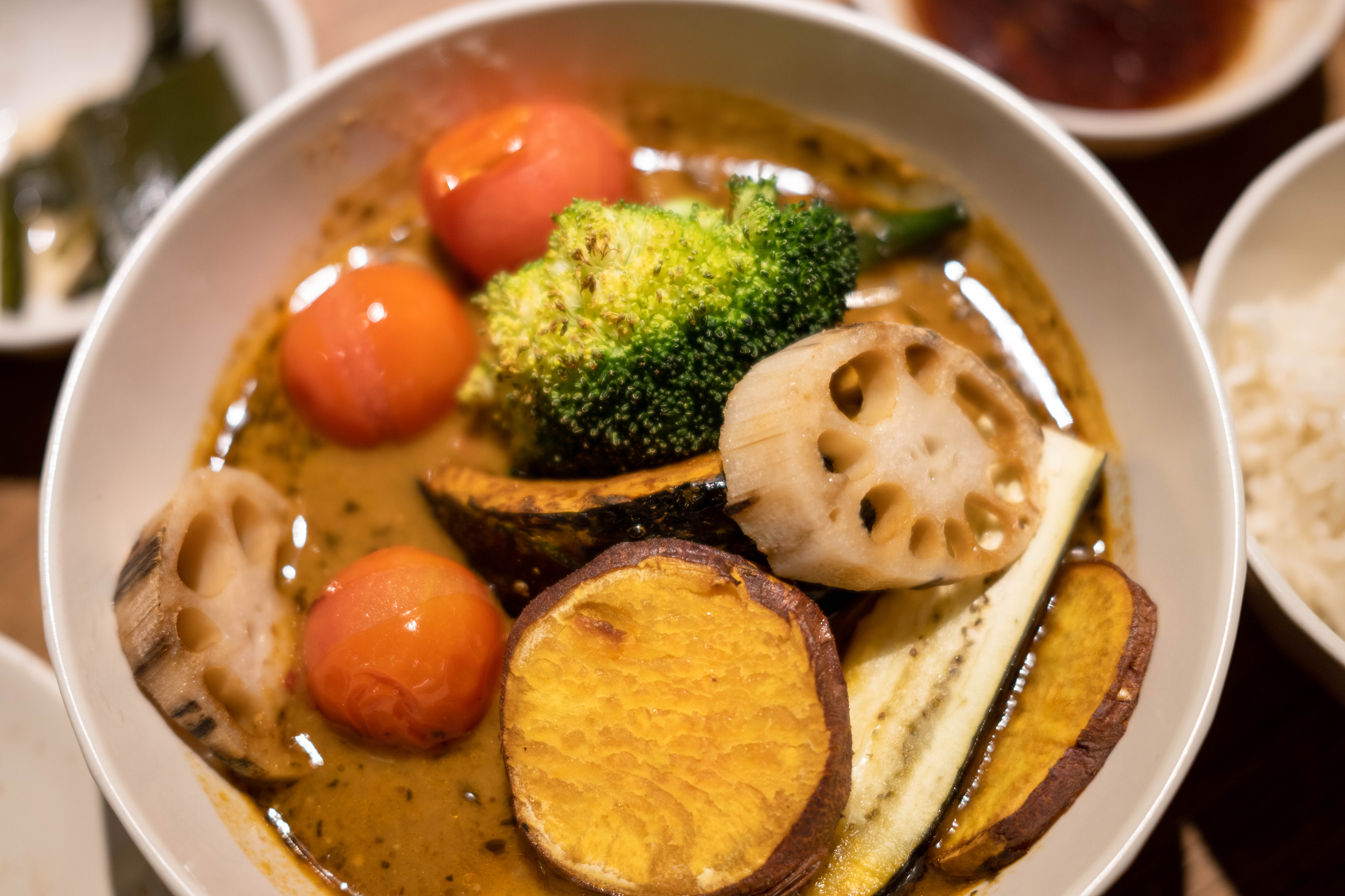 교양식사의 스프 카레의 가격은 13000원. 양은 한 명 내지 두 명이 먹을만한 양입니다. 야스노야는 2만원이 넘는 가격에 양도 좀 더 푸짐하고요. 가격도 양도 달라서 직접 비교는 어렵지만 메뉴의 구성 자체는 비슷해 보였어요. 향긋한 카레국(?)에 다양한 채소들.
