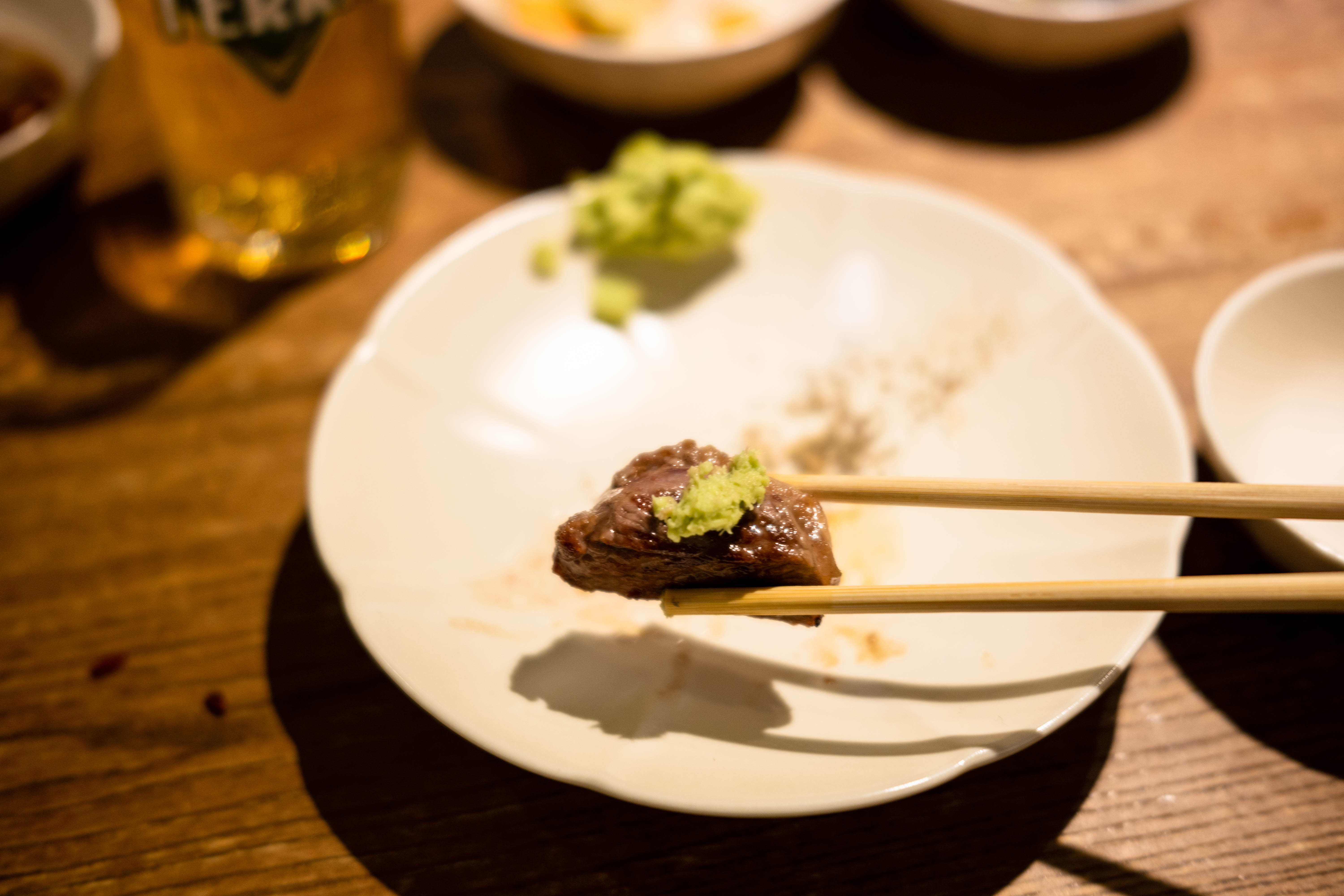 잘 구워진 고기. 첫 점은 역시 고추냉이를 올려 먹습니다.