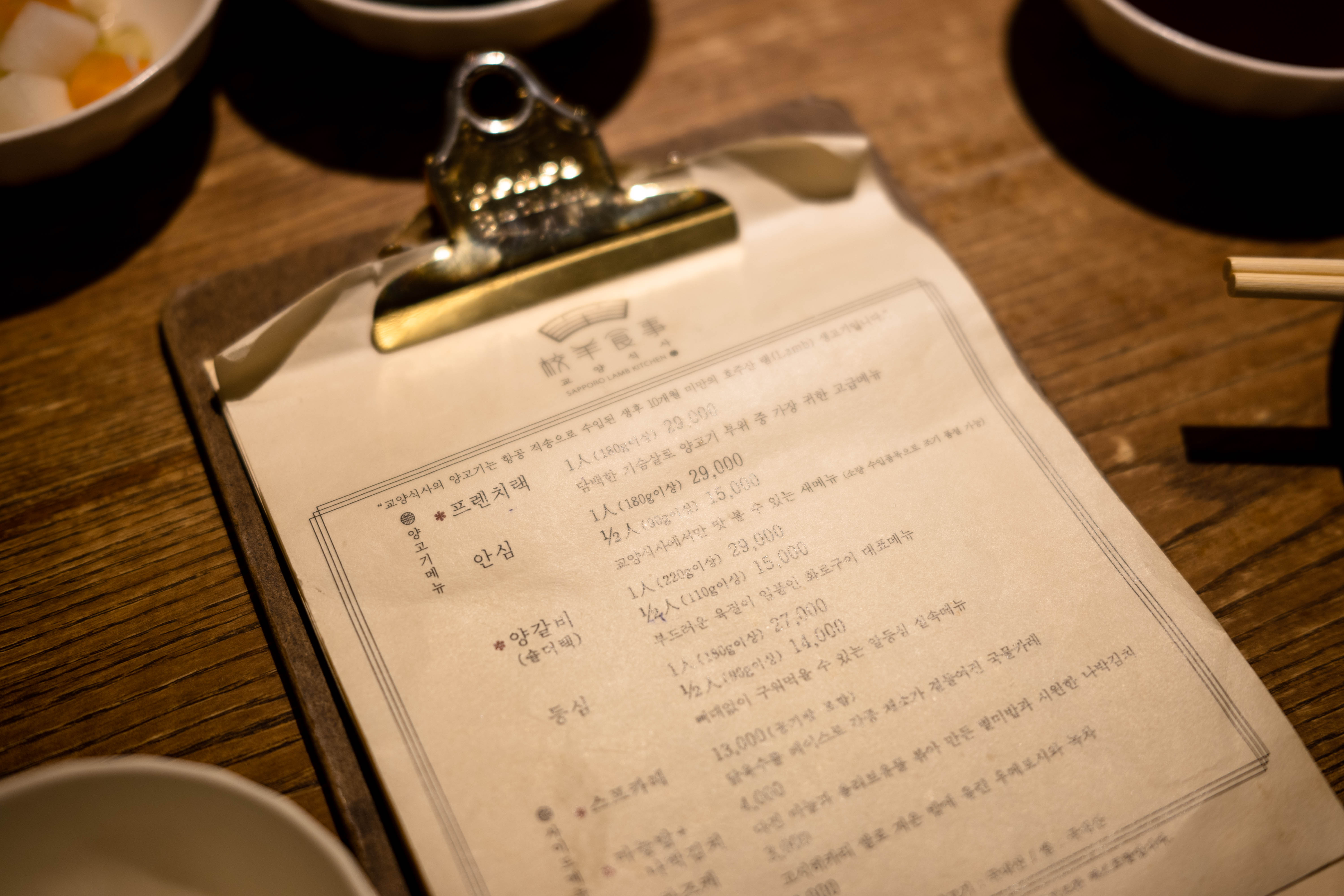 고기집같지 않게, 아니 고급 식당처럼 꾸민 인테리어에 나란히 앉아 먹을 수 있는 바 좌석과 테이블이 있습니다. 이번엔 신경 써서 메뉴판도 찍어 왔어요. 대표 메뉴는 프렌치랙. 10개월 미만의 어린 양을 공수한 고기들 중에서도 가장 귀한 부위라고 하죠. 거기에 안심, 갈비, 등심이 있습니다. 안심은 교양식사에서만 맛 볼 수 있는 메뉴라고 해서 프렌치 랙과 안심을 주문하려 했습니다만, 최근 안심이 공수가 되지 않는다고 합니다. 그래서 프렌치 랙과 등심을 주문했습니다. 미쉐린 가이드에 선정된 집이라 가격대가 높을 것으로 예상했습니다만 다른 집과 크게 차이가 나지 않습니다.