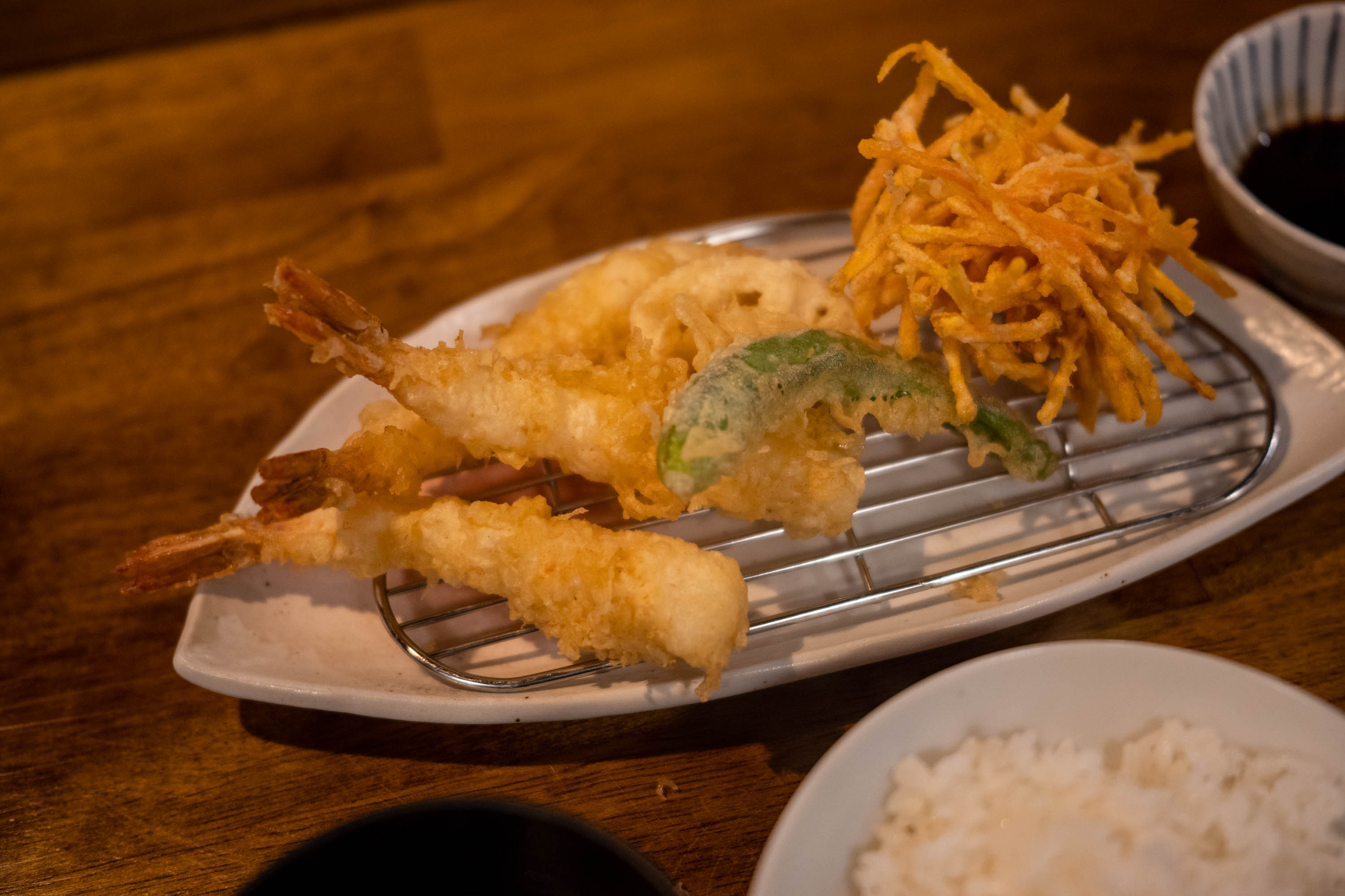 ㄷ자 형태의 바 타입 좌석에 둘러 앉아 주방에서 튀김을 튀기는 모습을 볼 수 있는 구조입니다. 갓 튀긴 튀김이 덮밥에 있는 눅눅한 튀김보다 좋더군요. 개인적으로 텐동보다 이곳의 튀김 정식 방식을 선호합니다. 모자란 밥과 튀김을 편하게 추가할 수도 있고요.
