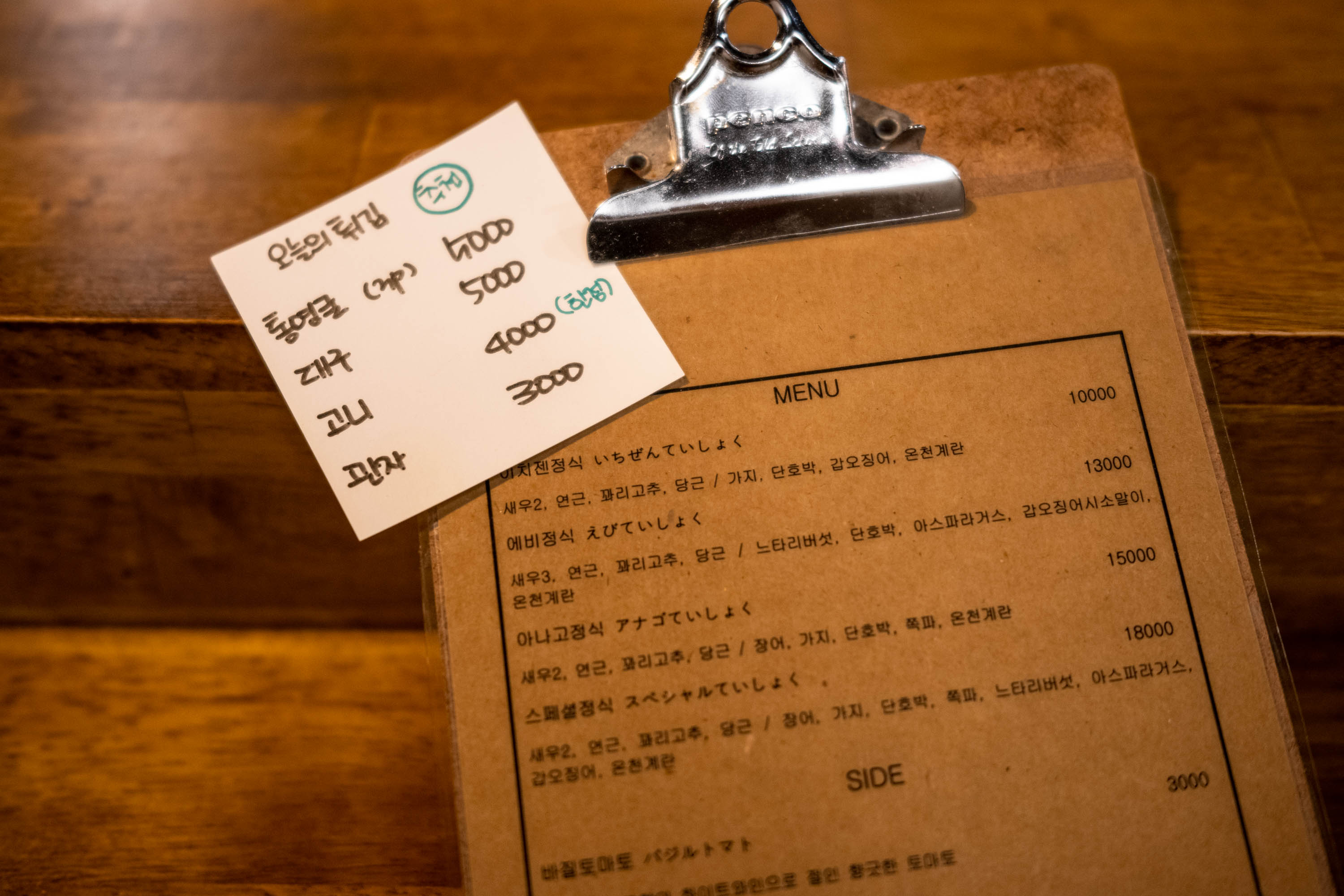 이치젠 망원점과 달리 이곳은 갓 튀긴 튀김을 반찬삼아 밥을 먹는 정식 스타일의 식당입니다. 네 가지 기본 정식이 있고 여기에 사이드 메뉴 그리고 철마다 다른 제철 재료 튀김을 추가하는 방식입니다. 기본 정식은 튀김의 종류와 수에 따라 가격이 다른데 이날은 첫 방문이라 기본 메뉴인 이치젠 정식, 그리고 사이드 메뉴로 바질 토마토를 주문했습니다.