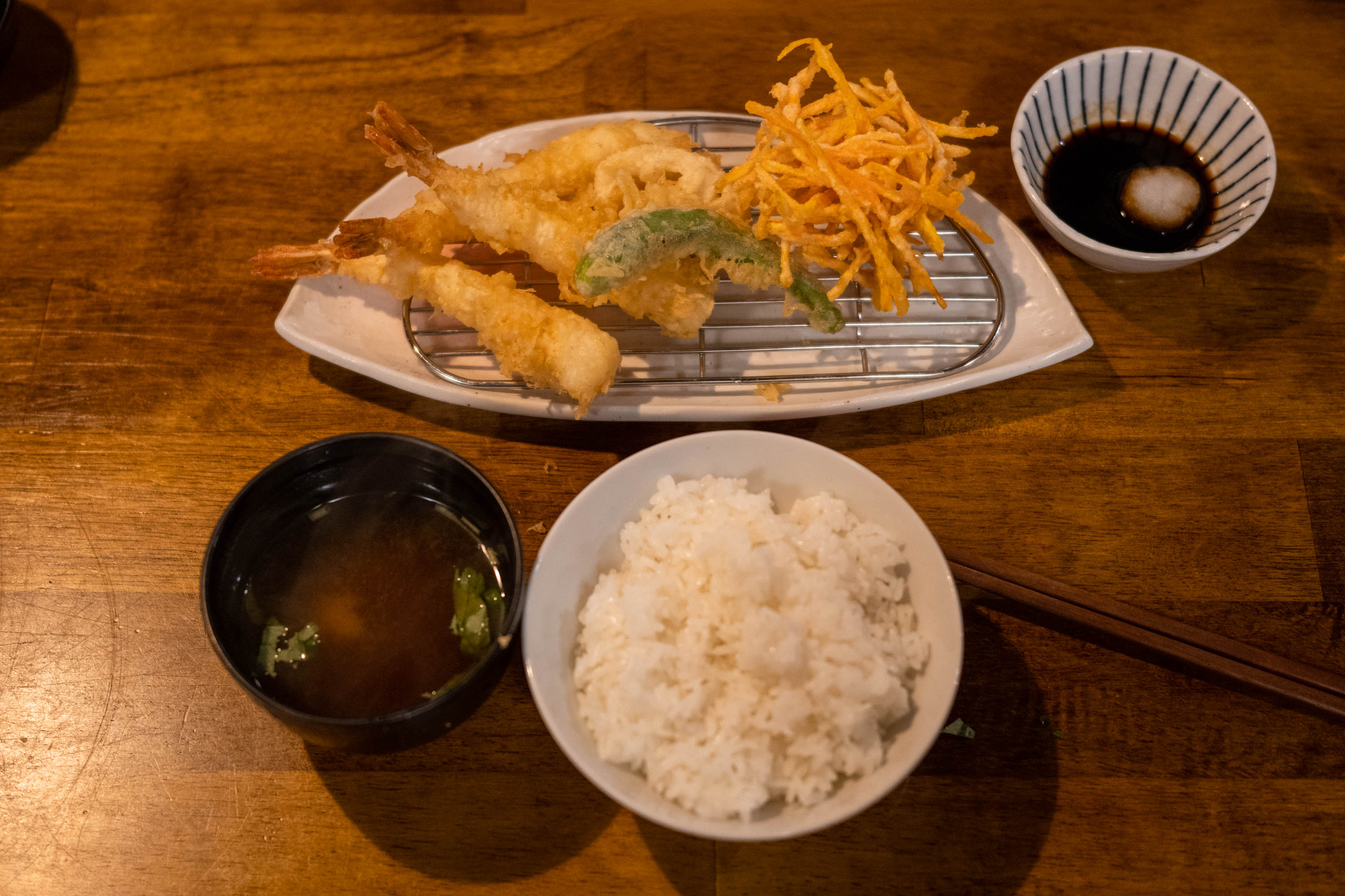 기본으로 밥과 장국, 그리고 튀김과 함께 먹을 소스가 나옵니다. 간장 소스와 소금이 있는데 몇몇 튀김은 서빙할 때 찍어먹을 소스를 추천해 준 것이 좋았습니다.