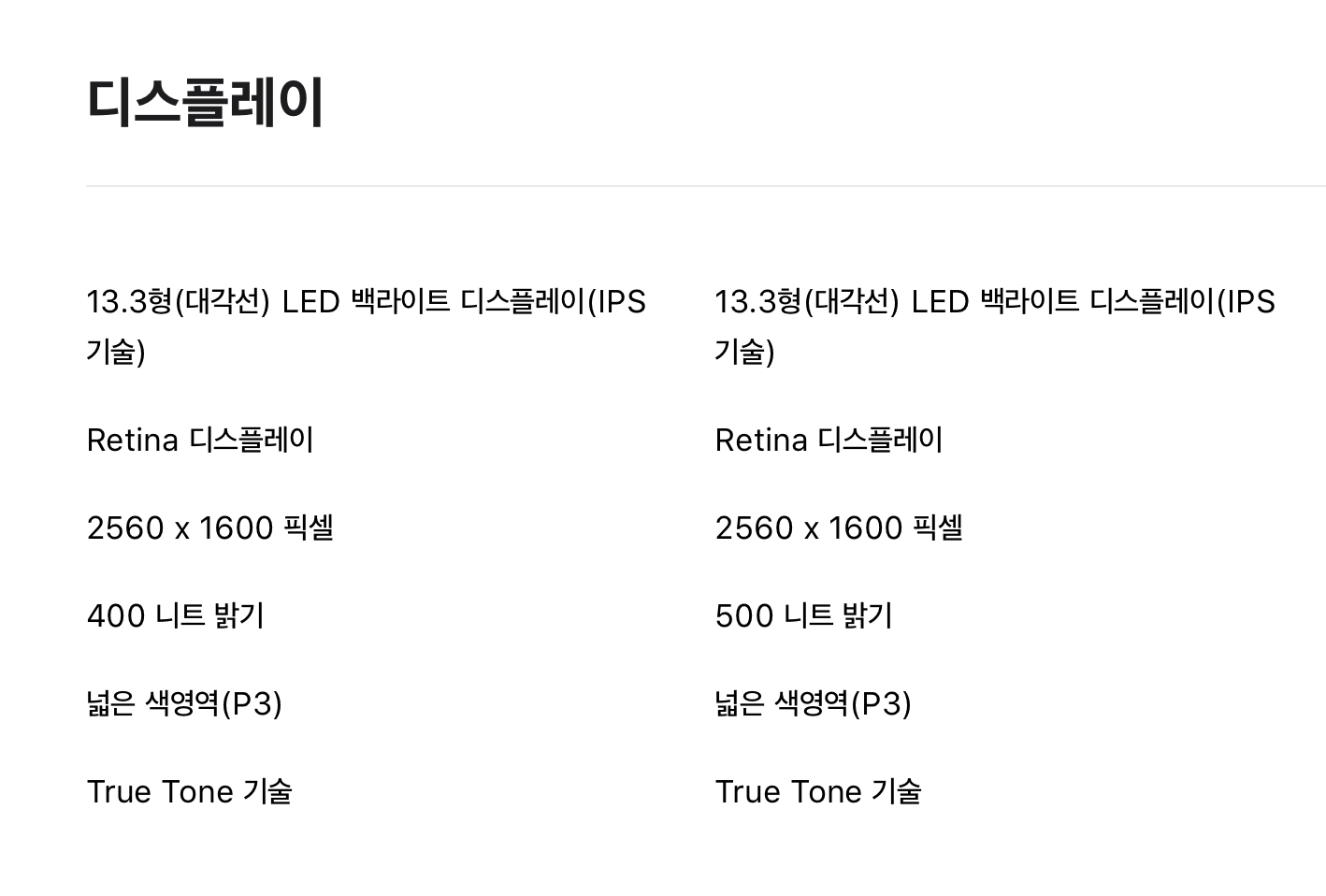 가장 고민했던 것은 디스플레이였습니다. 동일한 13.3인치 디스플레이지만 과거부터 맥북 에어와 맥북 프로 시리즈의 디스플레이의 품질 차이는 명확했거든요. 이 추세가 현재까지도 이어지긴 하지만 그 차이가 많이 줄었습니다. 이번 맥북 에어/프로의 디스플레이는 밝기의 차이 외에는 패널 종류와 해상도, 색영역 지원, 트루톤 지원까지 기본적인 사양이 동등합니다.