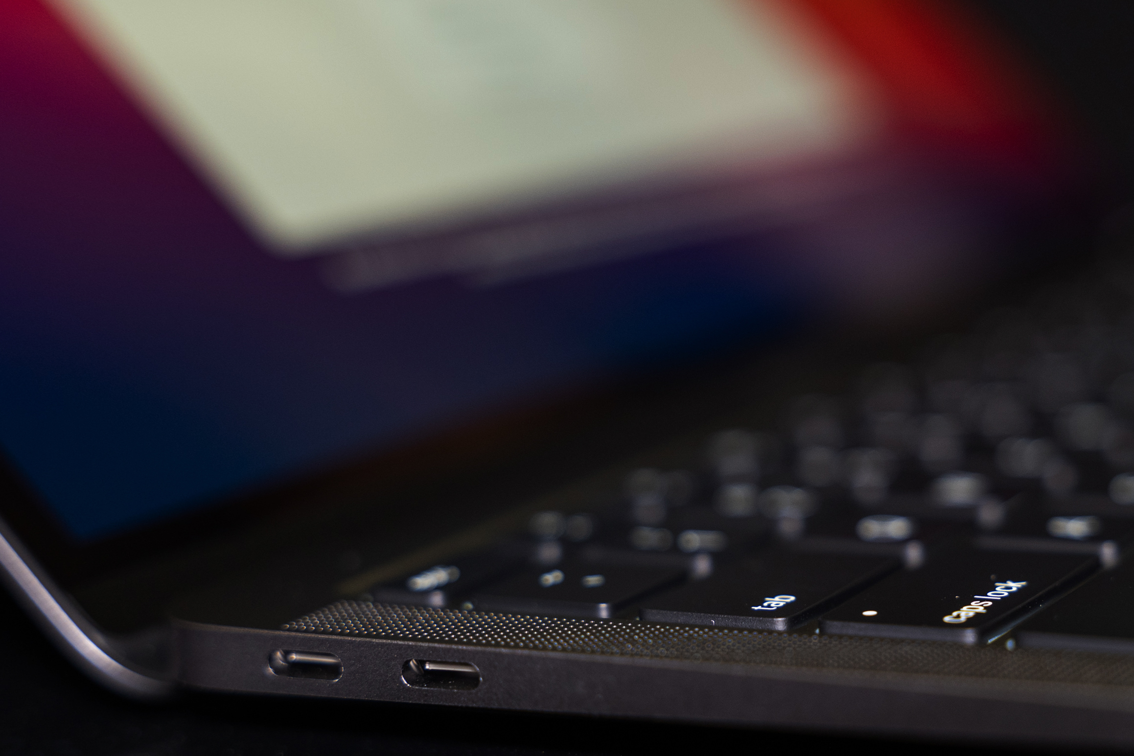 전체적인 실루엣은 기존 맥북 에어와 동일합니다. 13.3인치 폼팩터는 가로, 세로 크기가 맥북 프로 13 모델과 동일하며 두께에만 차이가 있습니다. 왼쪽에 썬더볼트3/USB4 포트 두 개, 오른쪽에 3.5mm 헤드폰 잭이 있습니다.
