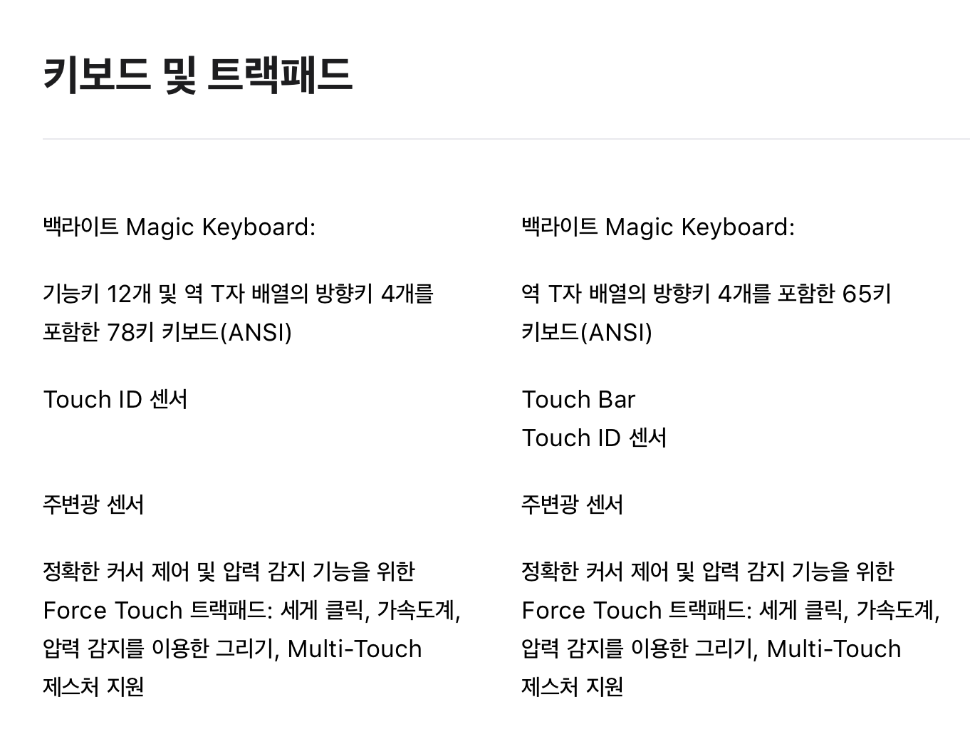 키보드는 모두 가위식 풀 사이즈 키보드가 탑재됐습니다. 차이는 맥북 에어의 F키와 맥북 프로의 터치 바. 개인적으로 터치바가 재미있고 활용하기에 따라 꽤 유용하기도 하지만 가격 차이를 상쇄할 정도의 매력은 없다고 판단했습니다. 오히려 조금 더 큰 트랙패드가 좀 더 욕심이 났어요. 터치바는 호불호가 크게 갈려서 오히려 터치바가 마이너스 요소라는 분들도 상당 수 있더라고요. 저는 같은 가격이면 터치바쪽을 선택하겠지만요.