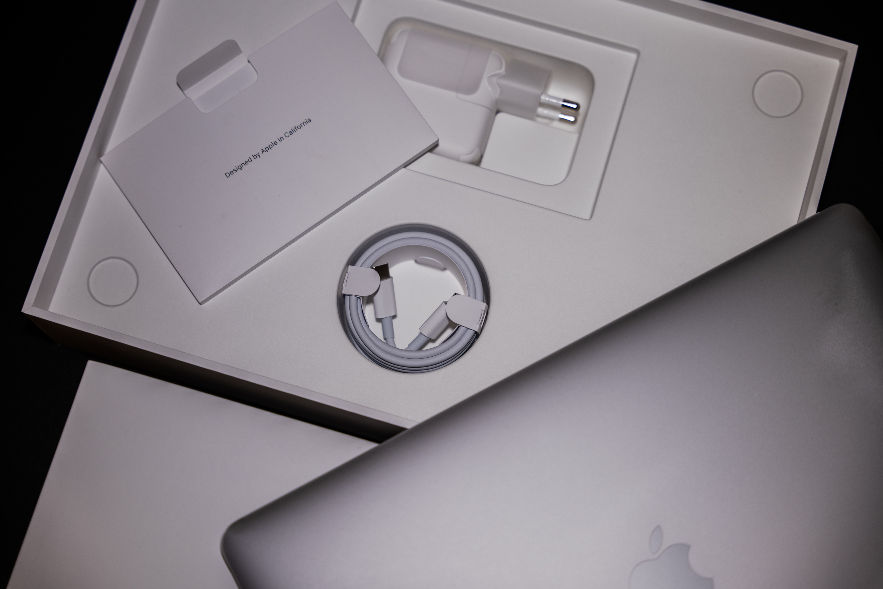 맥북 아래에는 30W USB C 어댑터와 C to C 케이블이 있습니다. 맥북 프로 13인치 모델에는 61W 어댑터가 기본 제공되는 것과 비교해 아쉽지만 그만큼 휴대하기 좋으니 이동이 많은 분들에겐 장점이 있겠습니다.