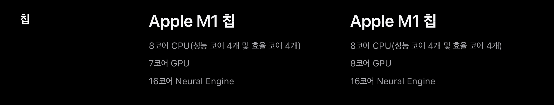 여기에 더해, 스펙 시트를 잘 살펴봐야 알 수 있는 차이 두개가 있습니다. 동일한 M1 칩의 GPU 코어 차이와 쿨링팬의 유무입니다.