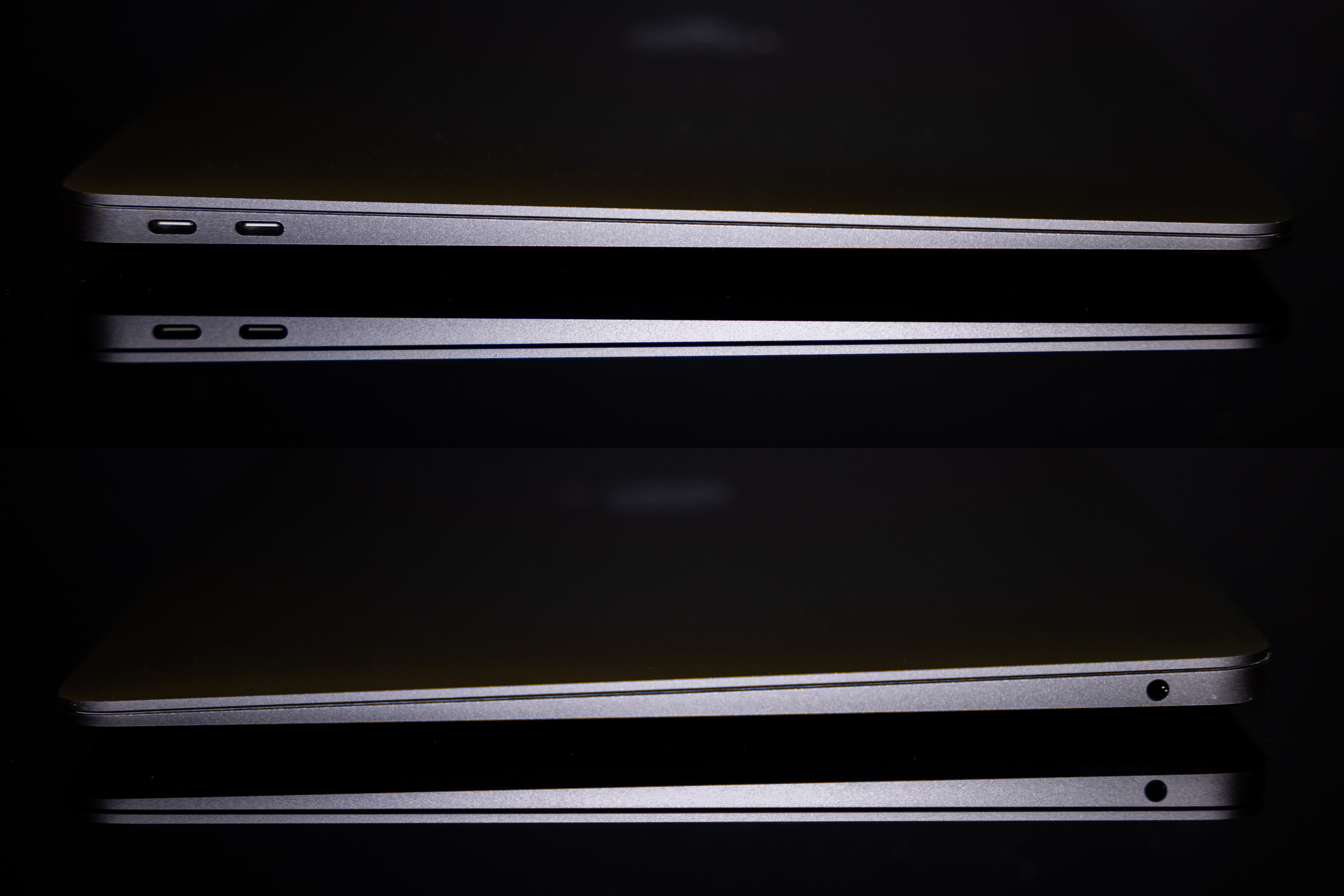 디자인은 개인 취향이니 차치하겠습니다. 개인적으로는 끝부분이 날렵한 맥북 에어를 좋아합니다. 외형에서 볼 수 있는 차이는 컬러가 되겠죠. 맥북 에어는 실버/스페이스 그레이/골드 세 가지 컬러가 있고 맥북 프로는 실버/스페이스 그레이 두 컬러가 있습니다. 하지만 이것도 '나는 꼭 골드 모델을 사야겠다'는 분이 아니라면 큰 차이가 되진 않겠네요.