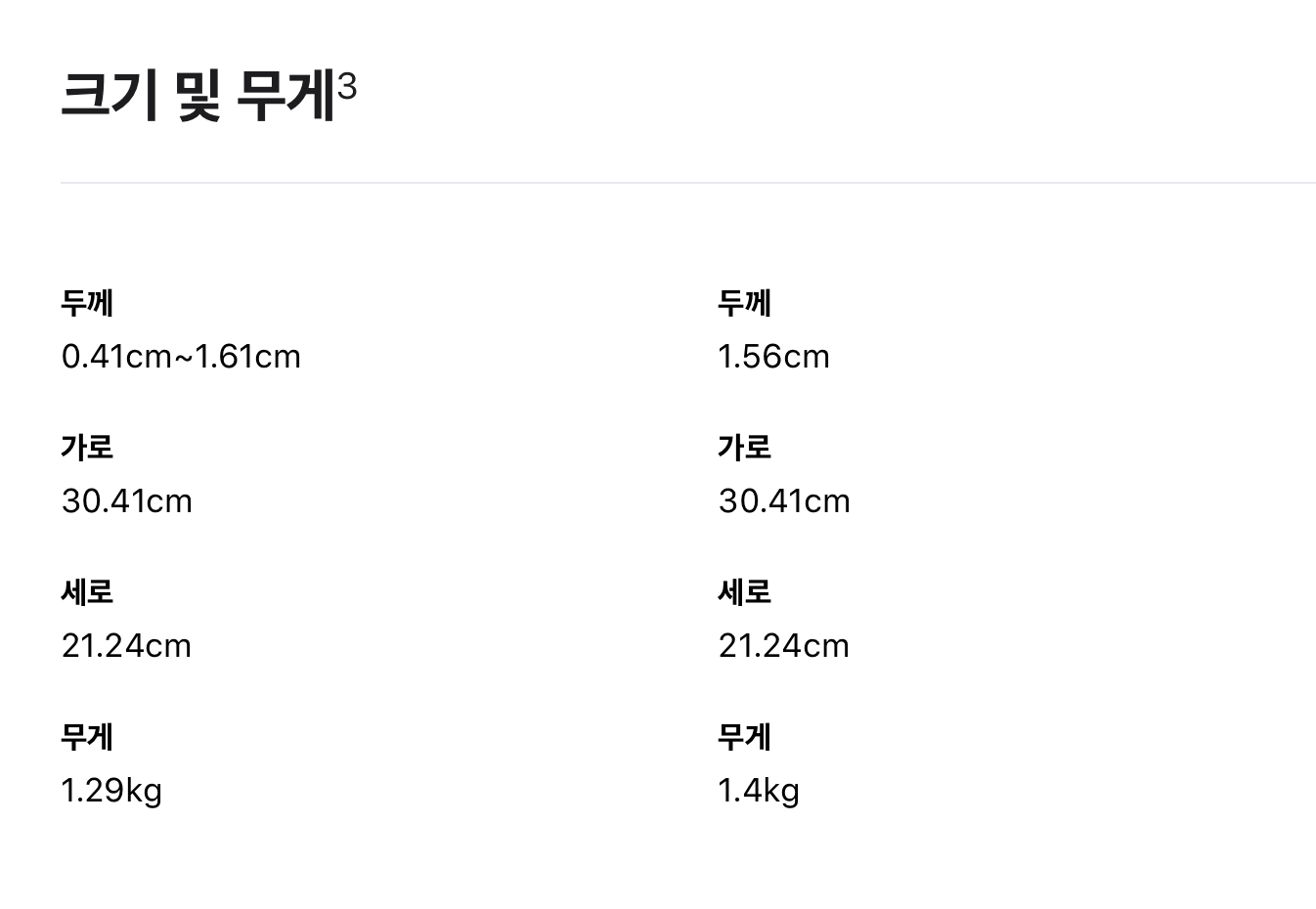 기본형 기준 두 모델의 가격 차이는 40만원이지만, 디스플레이와 키보드, 사운드 등에서 느껴지는 차이가 그 가격만큼이냐 하면 사용자마다 다르겠지만 저는 40만원 저렴한 맥북 에어쪽이 대다수의 사용자에게 더 합리적인 선택이라고 하겠습니다. 그래서 제가 맥북 에어를 주문했고요.
