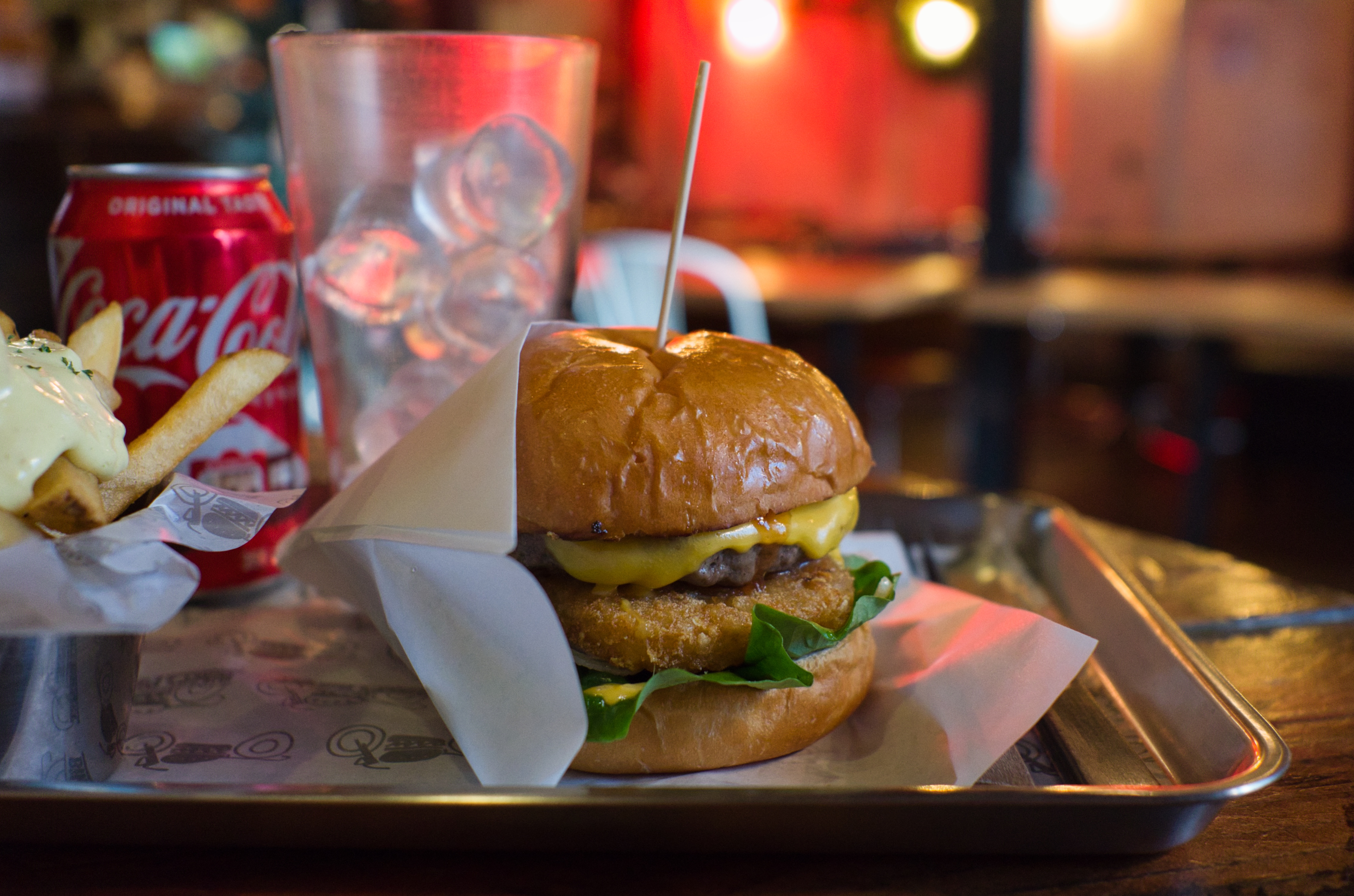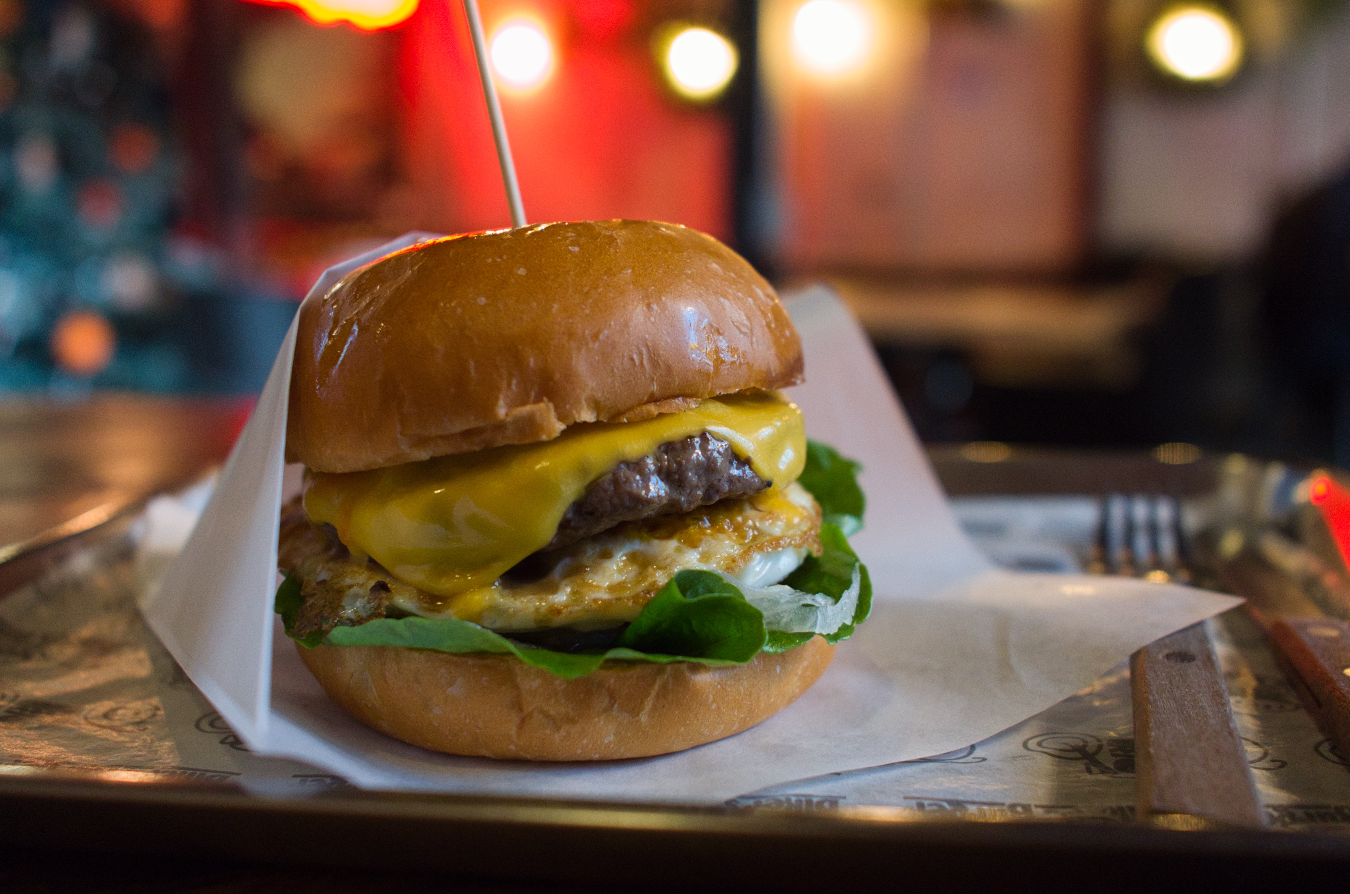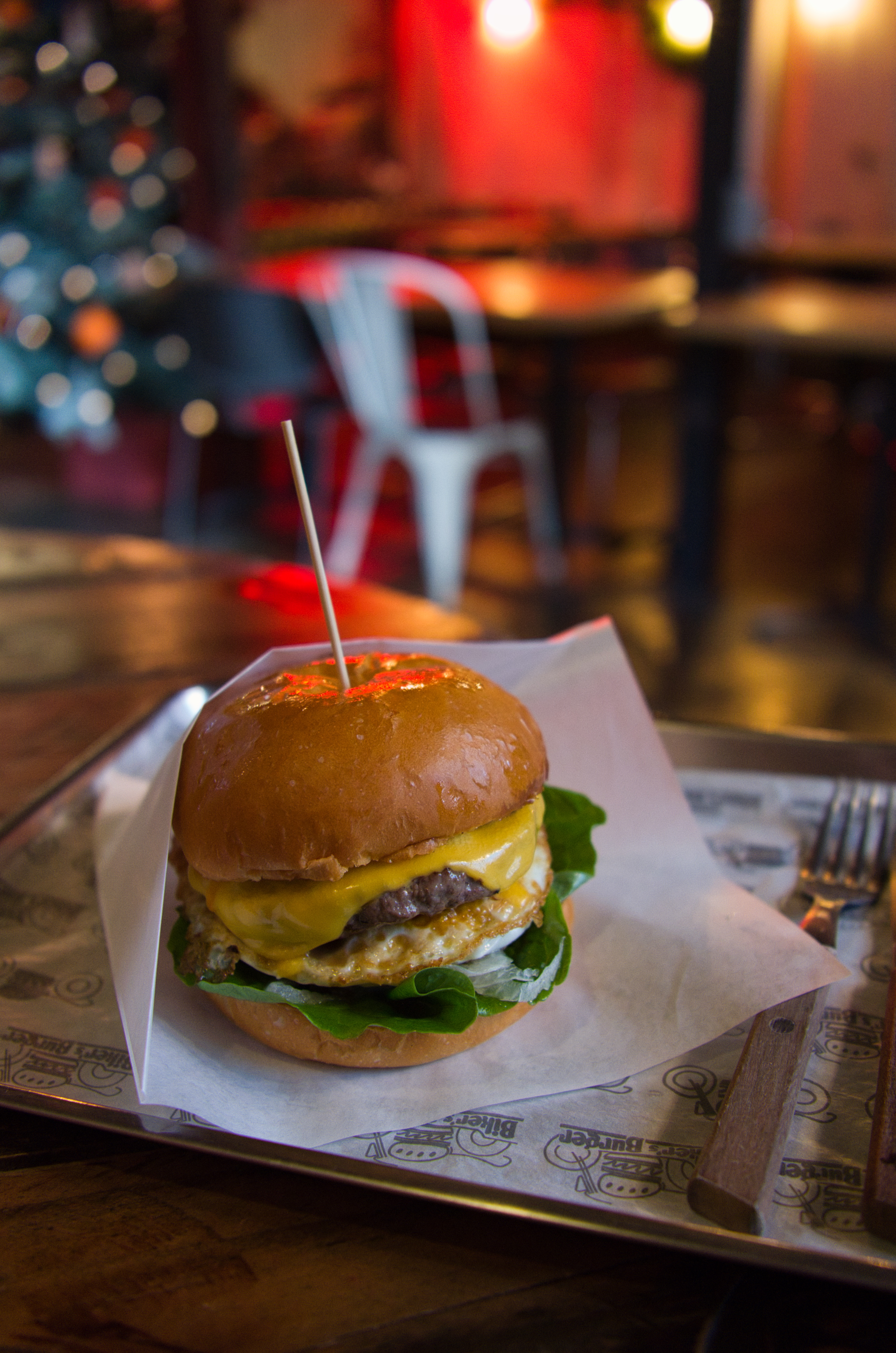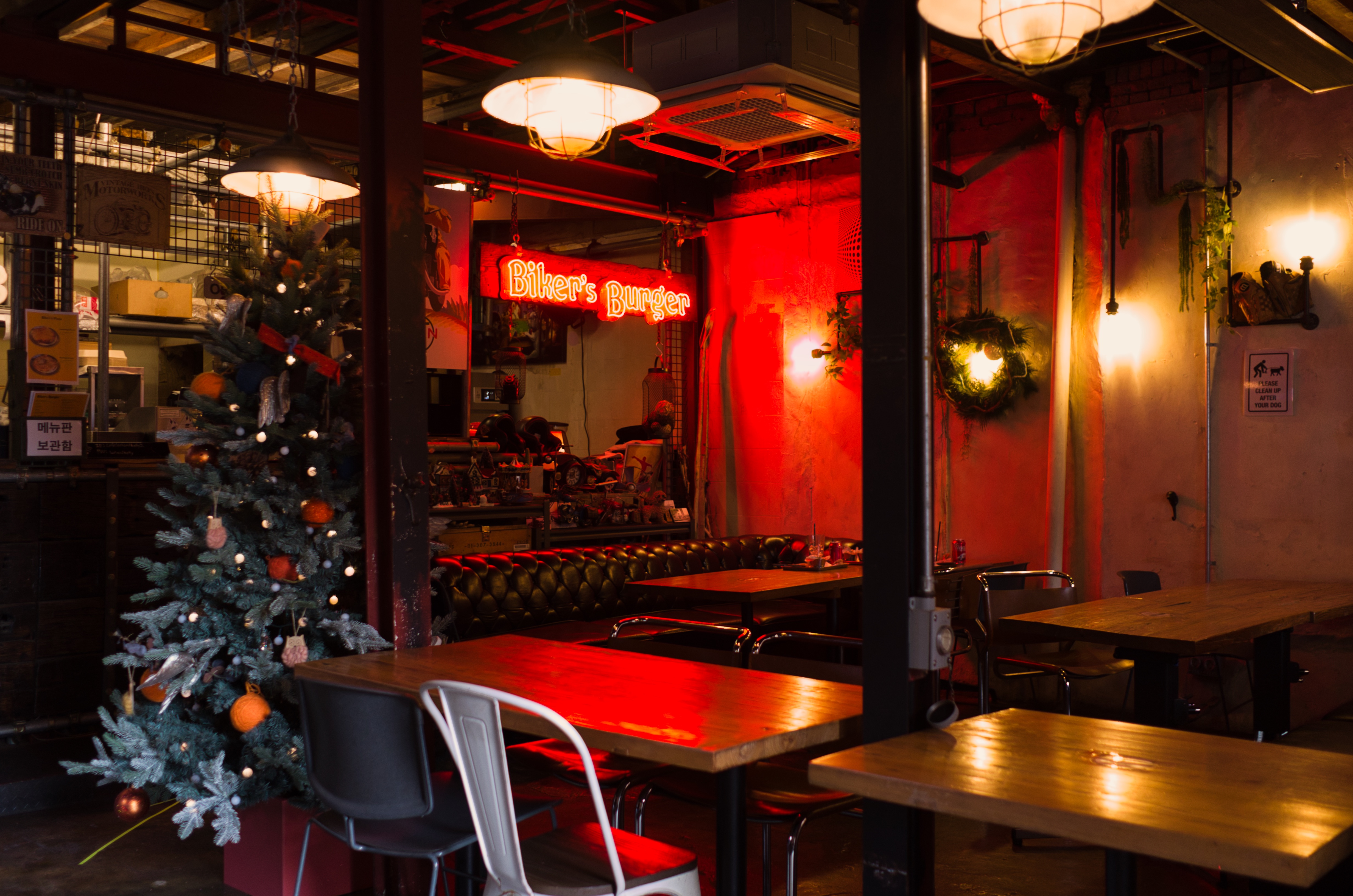 수제버거보다는 술이 어울리는 내부 공간. 방문한 날이 2020년 마지막 날이라 크리스마스 트리도 남아있고, 연말 분위기가 아직 남아있었습니다. 어둑어둑한 실내에 강렬한 조명. 시끌벅적하게 한 끼 하기 좋은 분위기였어요.