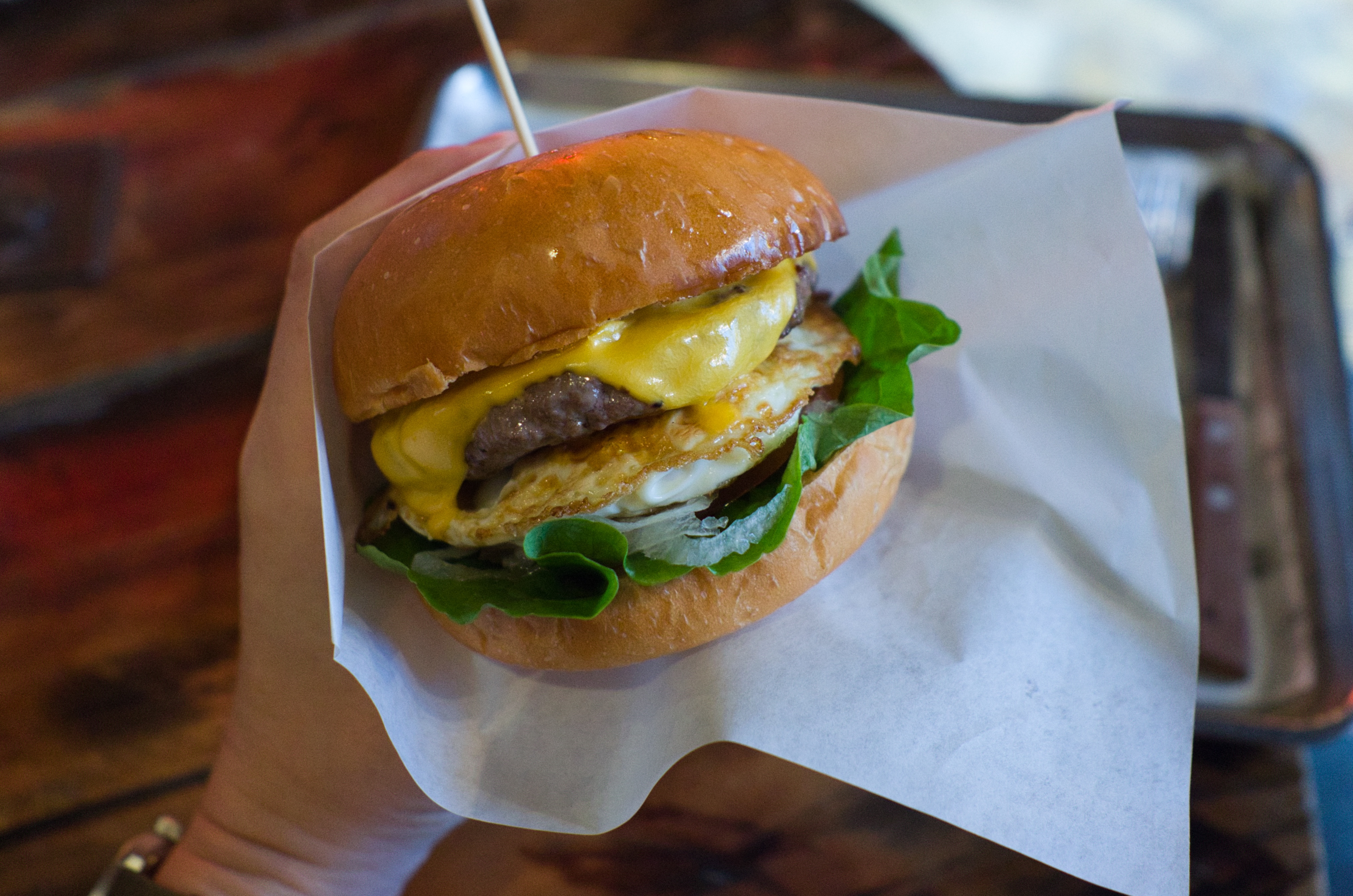 제가 주문한 버거는 대표 메뉴인 바이커 버거에 달걀을 추가한 것입니다. 모양을 보면 이상적으로 생각하는 폭신한 번, 윤기 나는 소고기 패티, 패티와 함께 익혀 군침 돌게 녹아 흐른 치즈, 선명한 녹색의 채소 등의 요소가 잘 갖춰져 있습니다. 대표 메뉴격인데 라구 소스 버거보다 소스 맛이 강하지 않아 이집의 장점인 소고기 패티의 육향이 잘 느껴졌어요. 달걀은 노른자가 흐르는 반숙이라 맘에 들었는데, 아쉽게도 이 버거에는 그리 어울리는 것 같지 않습니다. 그래도 빵과 고기가 맛있으니 일단 절반 이상은 먹고 들어갑니다.