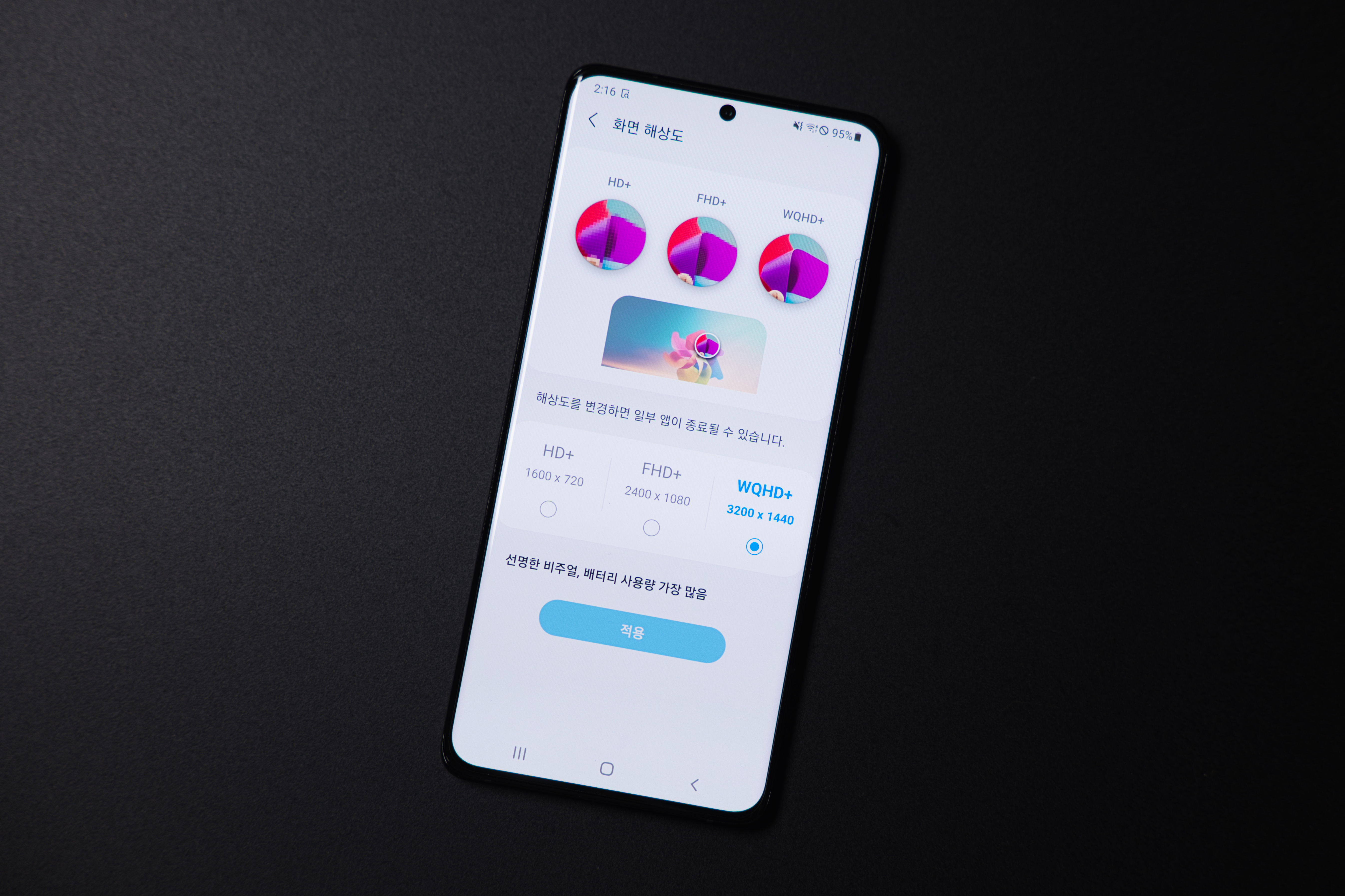 제가 가장 관심을 갖는 화면 해상도. 7인치에 달하는 커다란 화면을 얼마나 선명하고 밝게 사용할 것인지 선택하는 메뉴인데, 기본은 FHD+로 되어 있습니다. 사실상 이 정도 크기의 모바일 환경에서는 FHD급 이상의 해상도가 크게 구별이 되지 않아서 성능과 배터리 소모, 밝기 등에 이점이 있는 FHD급 디스플레이를 사용하는 것이 일반적이지만 역시나 프리미엄 모델답게 화면 해상도는 WQHD+ 급으로 채용했습니다. 저는 이 가격과 크기의 프리미엄 스마트폰을 사용하면서 해상도를 낮춰 사용하는 것이 뭔가 아쉬워서 체험 기간 동안에는 WQHD+ 모드로 사용했습니다. 혹시나 최신 갤럭시 스마트폰을 사용하는데 화면이 뭔가 선명하지 않다 싶으면 해상도 설정을 확인해 보세요.