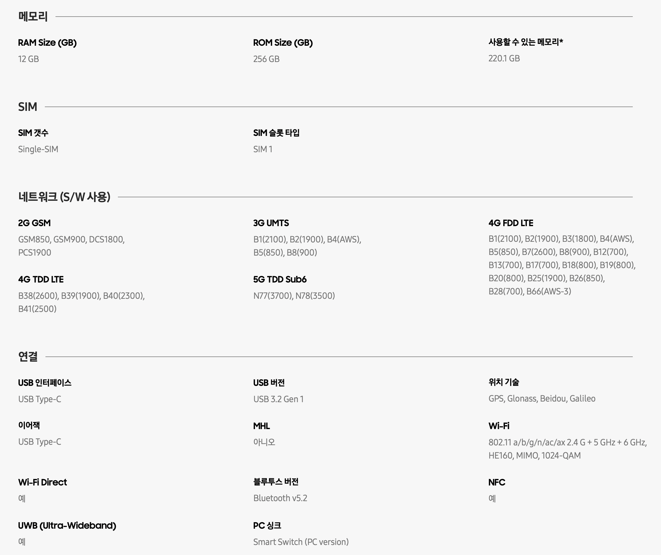간단히 갤럭시 S21 울트라 5G 모델의 사양을 살펴보면,