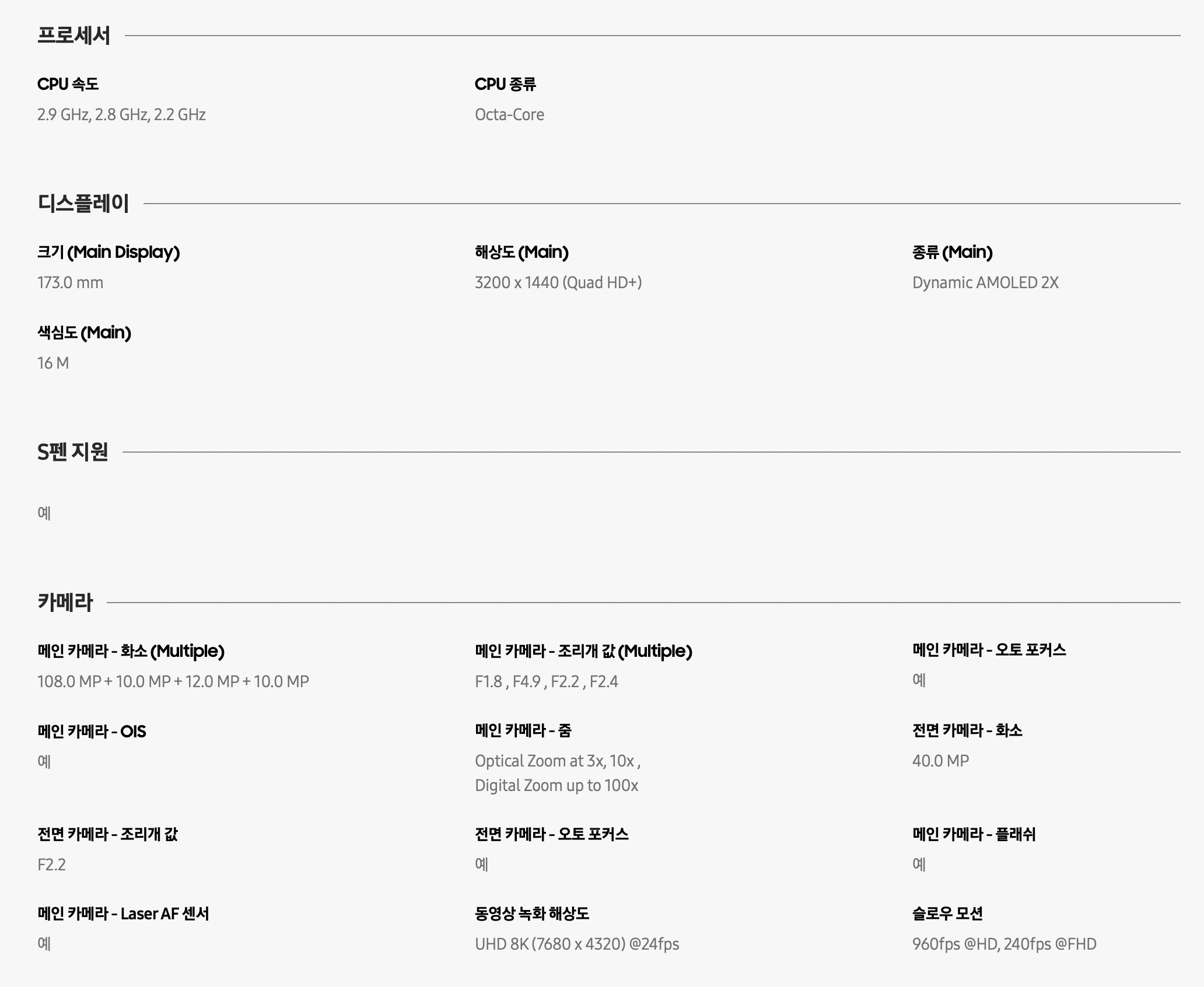 화면 크기는 6.8인치로 전작보다 0.1인치 작아졌지만 큰 차이는 아니고 해상도는 3200 x 1440으로 동일합니다. 하지만 패널 품질 자체가 전작보다 좋아졌다고(는) 합니다. 후면 카메라는 1200만 화소 초광각, 1억 800만 화소 광각, 10배 줌 1000만 화소 망원과 3배 줌 1000만 화소 망원까지 총 4개로 이뤄져 있습니다. 거기에 8K 동영상 촬영으로 카메라에 힘을 많이 준 모양새입니다.