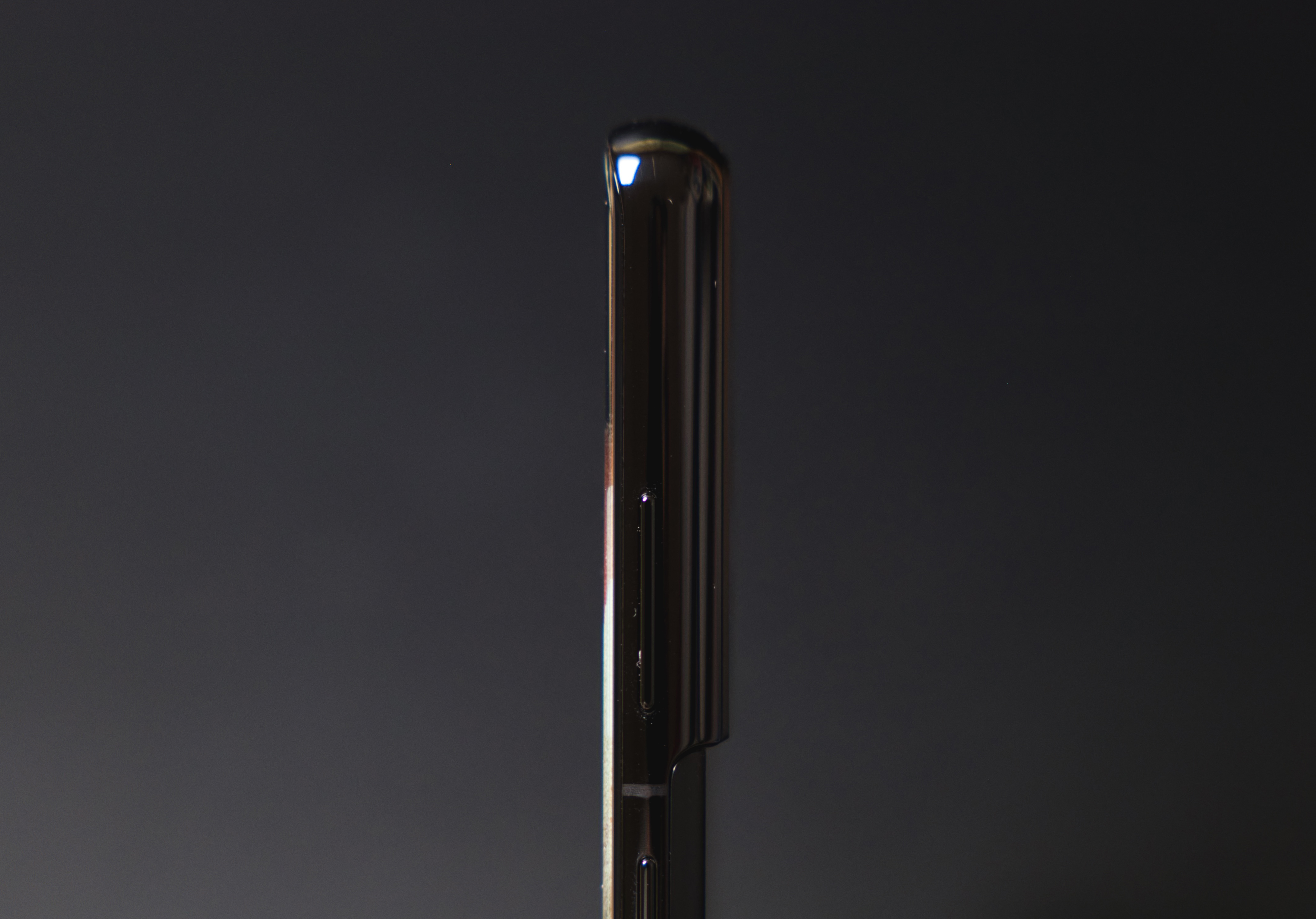 이제 제조사를 막론하고 가장 관심을 받는 '카툭튀' 디자인. S21 울트라 모델을 옆에서 보면 이렇습니다. 사이드와 자연스럽게 이어져서 돌출되는 느낌을 억제했습니다. 물론 이 반대편에서 보면 플랫한 후면부에 카메라가 얹어진 모양이 계단처럼 되어 있어서 영락없이 튀어나와 보이지만 그럭저럭 머리 잘 썼다는 느낌입니다. 옆면은 후면과 대비되는 매끈하고 반짝이는 크롬 마감을 했습니다.
