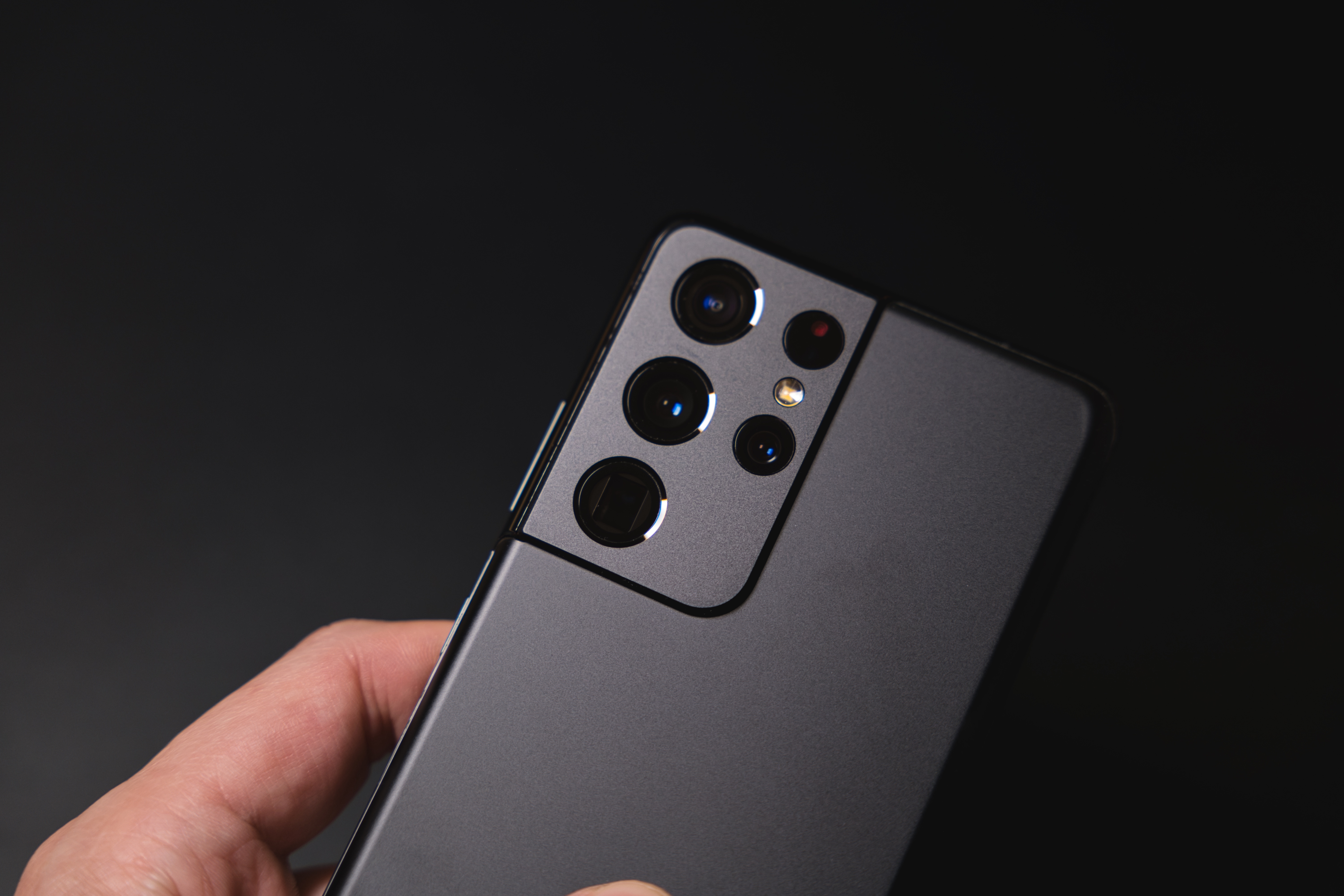 카메라 부분까지 후면과 동일한 소재와 질감으로 마무리해 완성도를 높였습니다. 이점은 아이폰 후면 디자인보다 더 좋게 느껴집니다. 카메라 수가 많아지다보니 플래시까지 총 여섯 개의 원을 배치해야 하는데, 메인급 카메라 세개를 왼쪽에, 망원 카메라와 AF를 담당하는 TOF 카메라, 플래시를 오른쪽에 배치에 균형을 맞췄습니다. 최선인지는 모르겠지만 다른 제품들과 비교해 그럭저럭 보기 좋습니다. 개인적으로 근래 나온 갤럭시 시리즈 중 후면 디자인은 1등 주겠습니다.