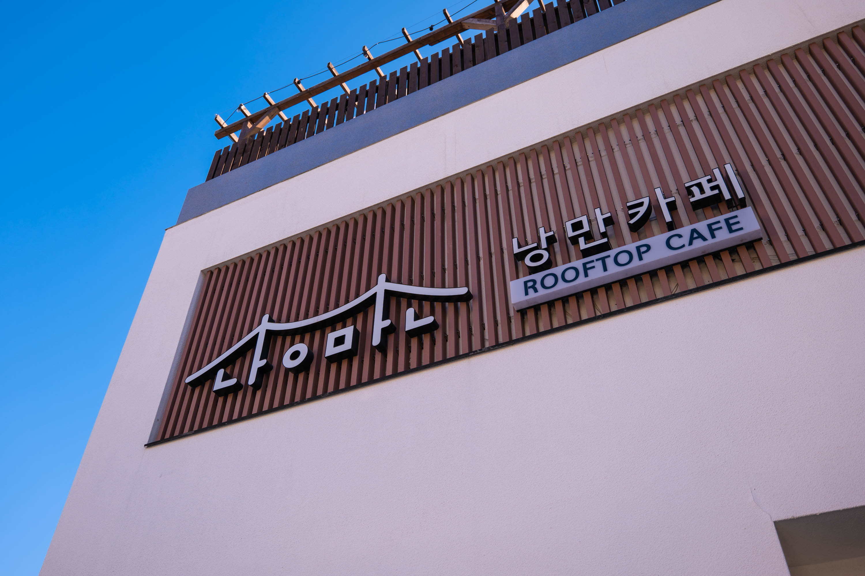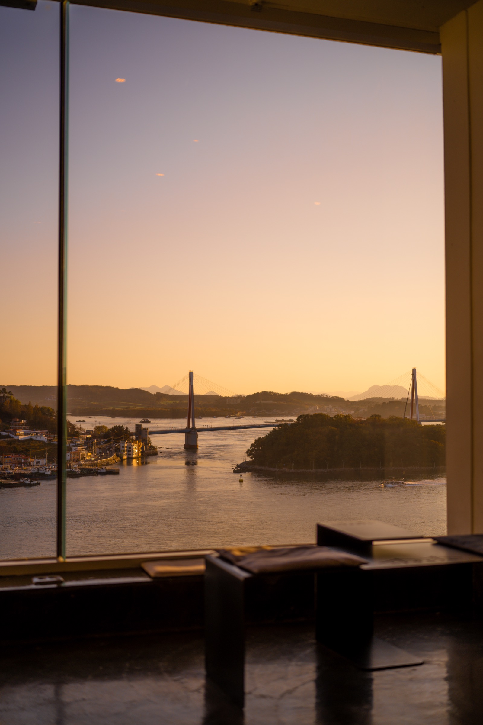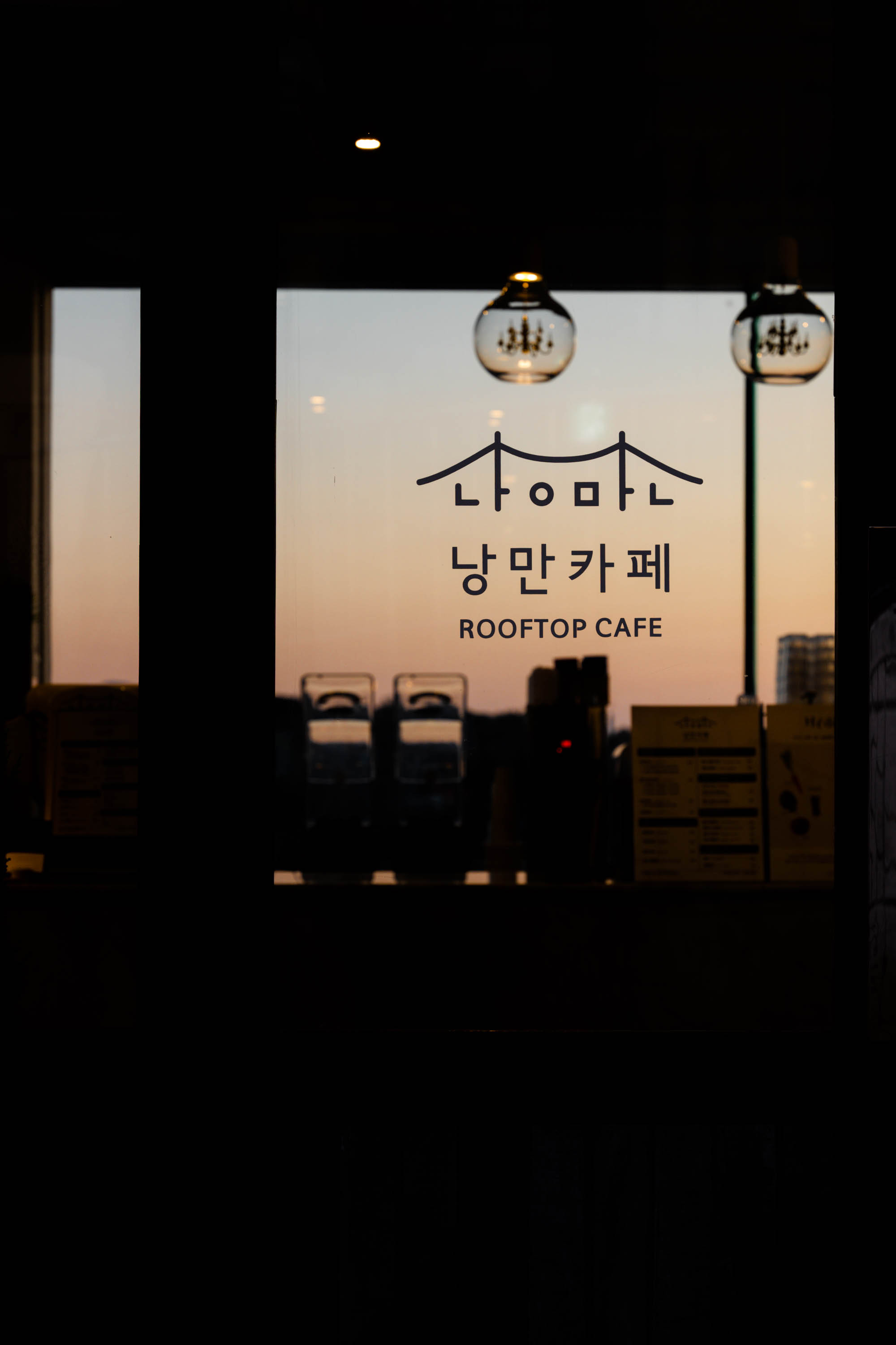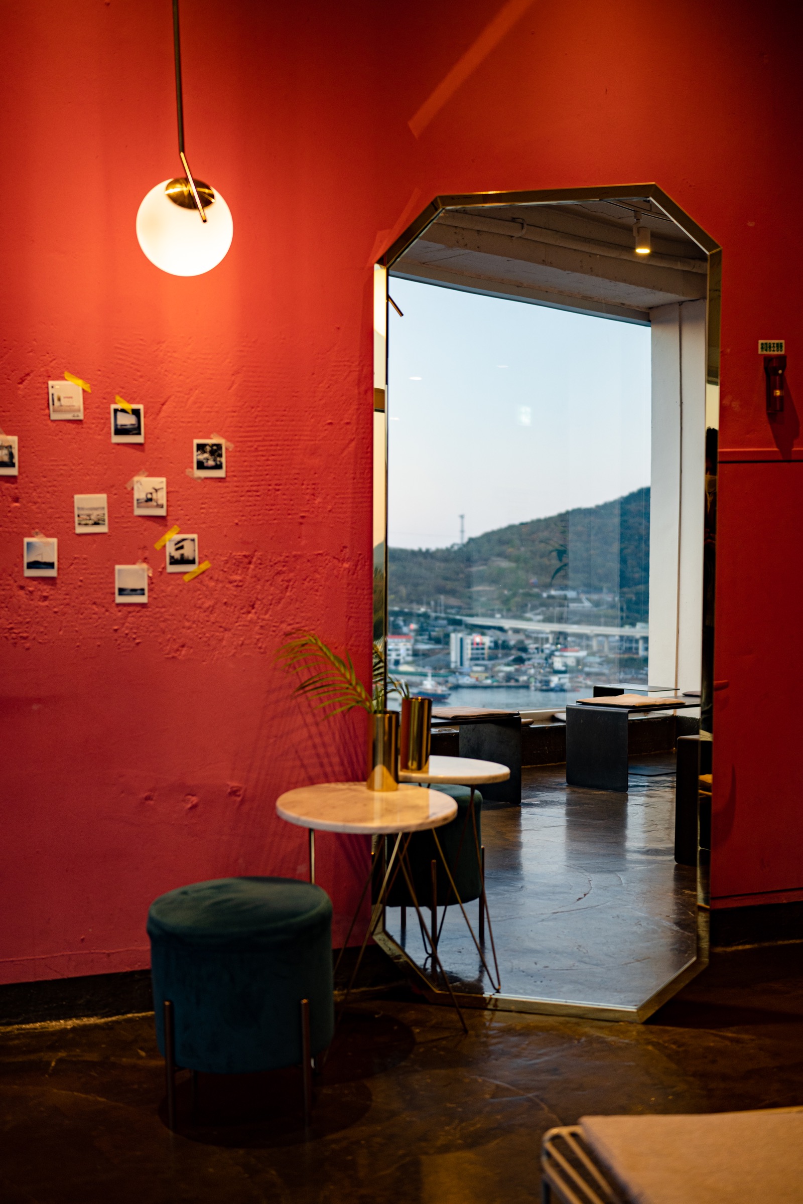 낭만 카페를 대표하는 뷰는 역시 옥상에서 보는 여수 풍경입니다. 제법 높은 건물 옥상이라 앞이 탁 트이고 눈 앞에 돌산도와 돌산 대교, 거북선 대교 등 여수 구항구 풍경이 파노라마로 펼쳐집니다. 오전, 오후, 저녁 시간마다 느낌이 달라서 여기 있으면 생각보다 오랜 시간을 보내게 됩니다. 그 중 옥상 구석에 있는 이 네모난 창은 포토 스팟으로 인기가 많죠. 예전엔 여기가 경쟁 치열한 좌석이었는데, 요즘은 포토존으로 바뀌었습니다.