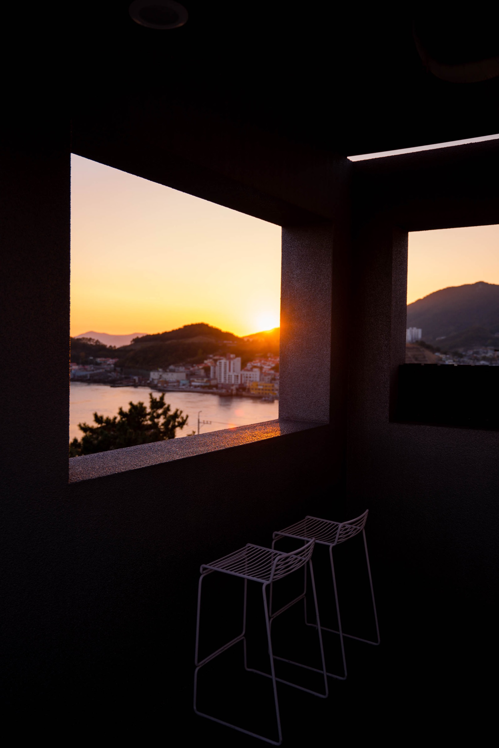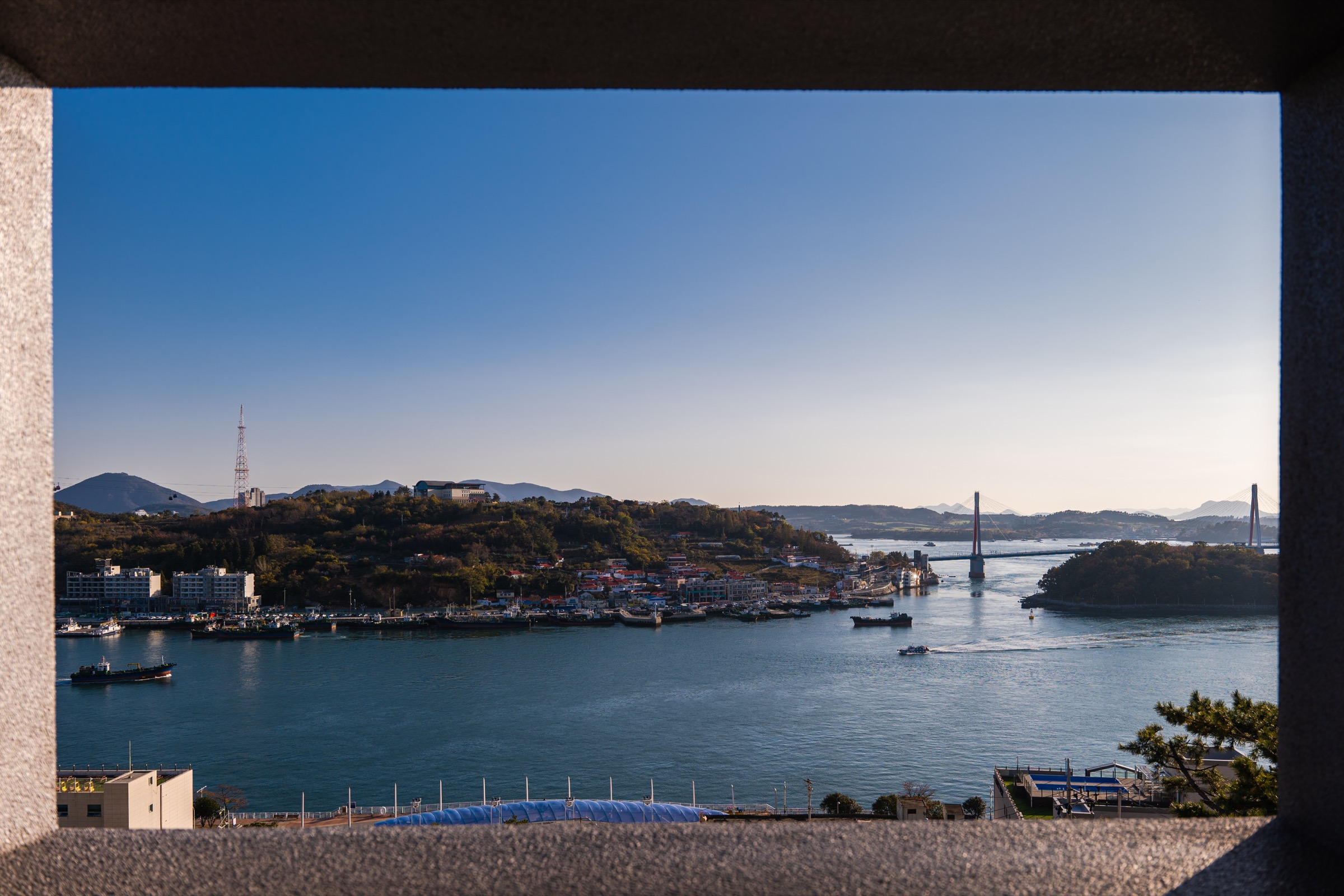 네모난 콘크리트 프레임 속으로 보는 여수 바다. 여기 오면 꼭 같은 구도로 사진을 찍습니다. 이날은 코로나에 겨울 시즌이라 옥상에 있던 테이블과 의자는 다 빠져있었고, 잠시 루프탑 뷰를 즐기고 내려가는 사람들이 많았습니다.