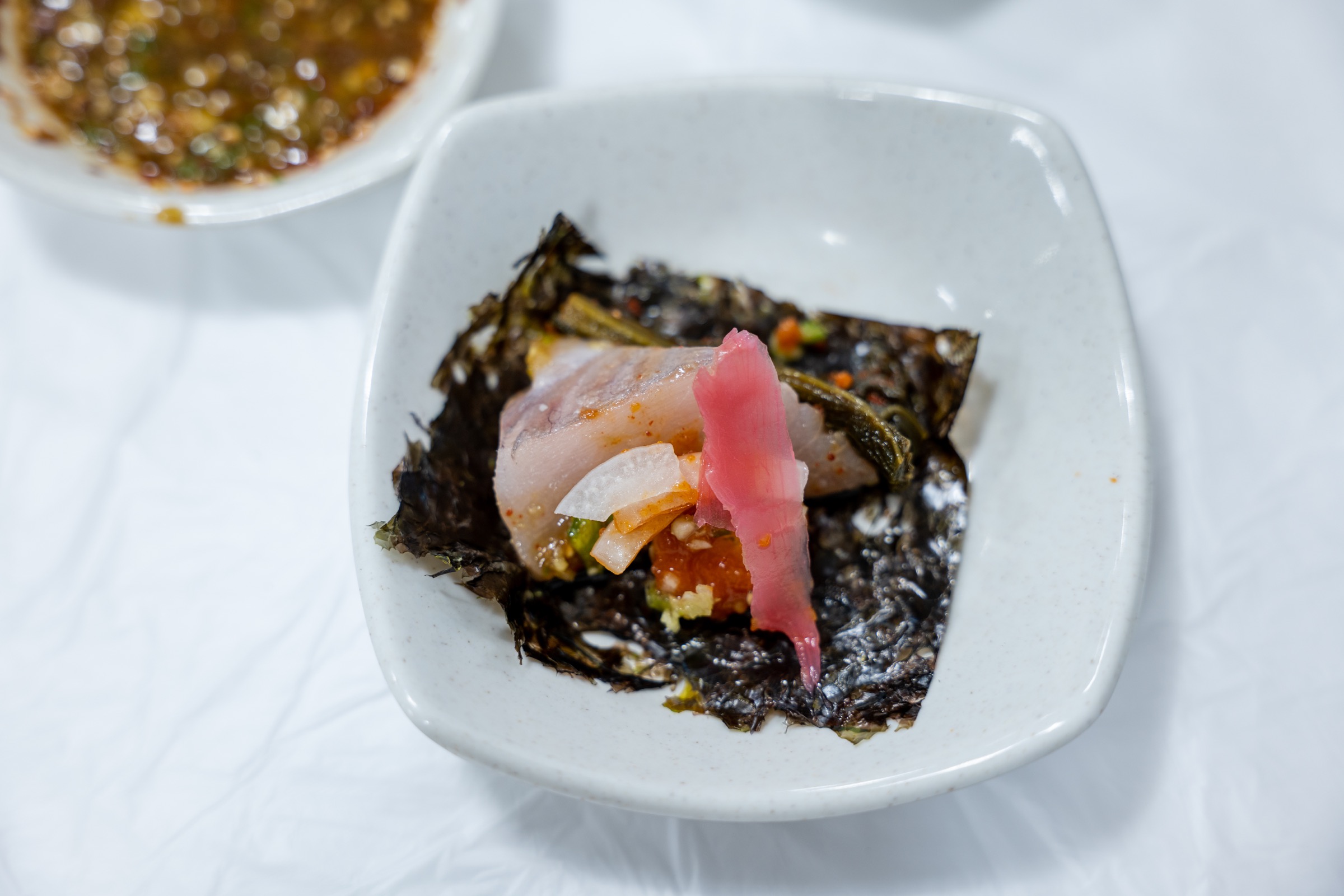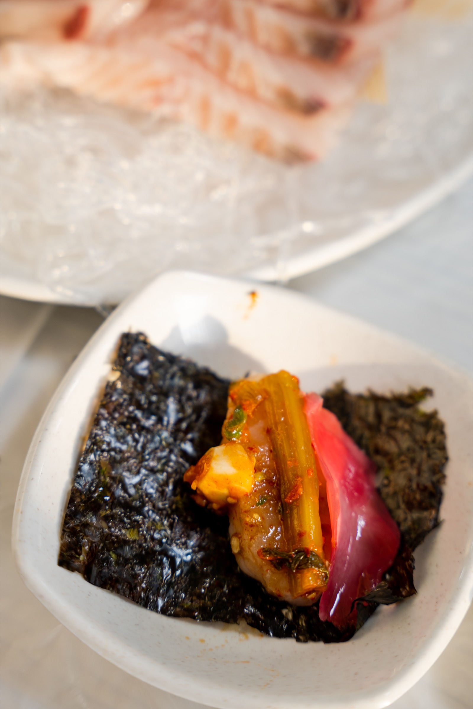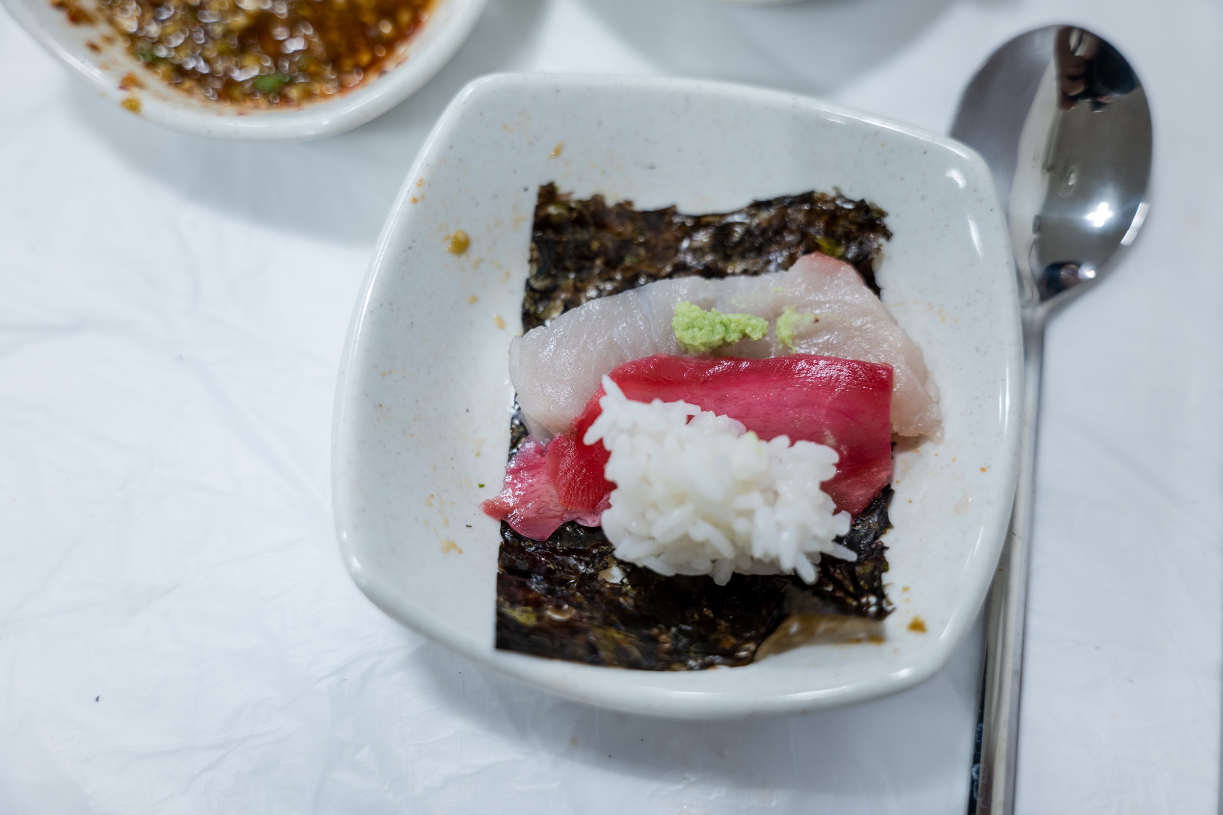 공기밥을 추가하면 이렇게 회 한점과 고추냉이, 초생강을 김에 싸 초밥으로 먹는데 이것도 입에서 녹아내리는 맛이 일품입니다. 배도 든든히 부르고요. 작은 사이즈의 선어회를 두 명이 넘으면 배가 잔뜩 부르기보단 적당히 기분 좋은 정도의 양인데 이렇게 밥을 추가해 반찬과 함께 먹으면 만족스럽죠.