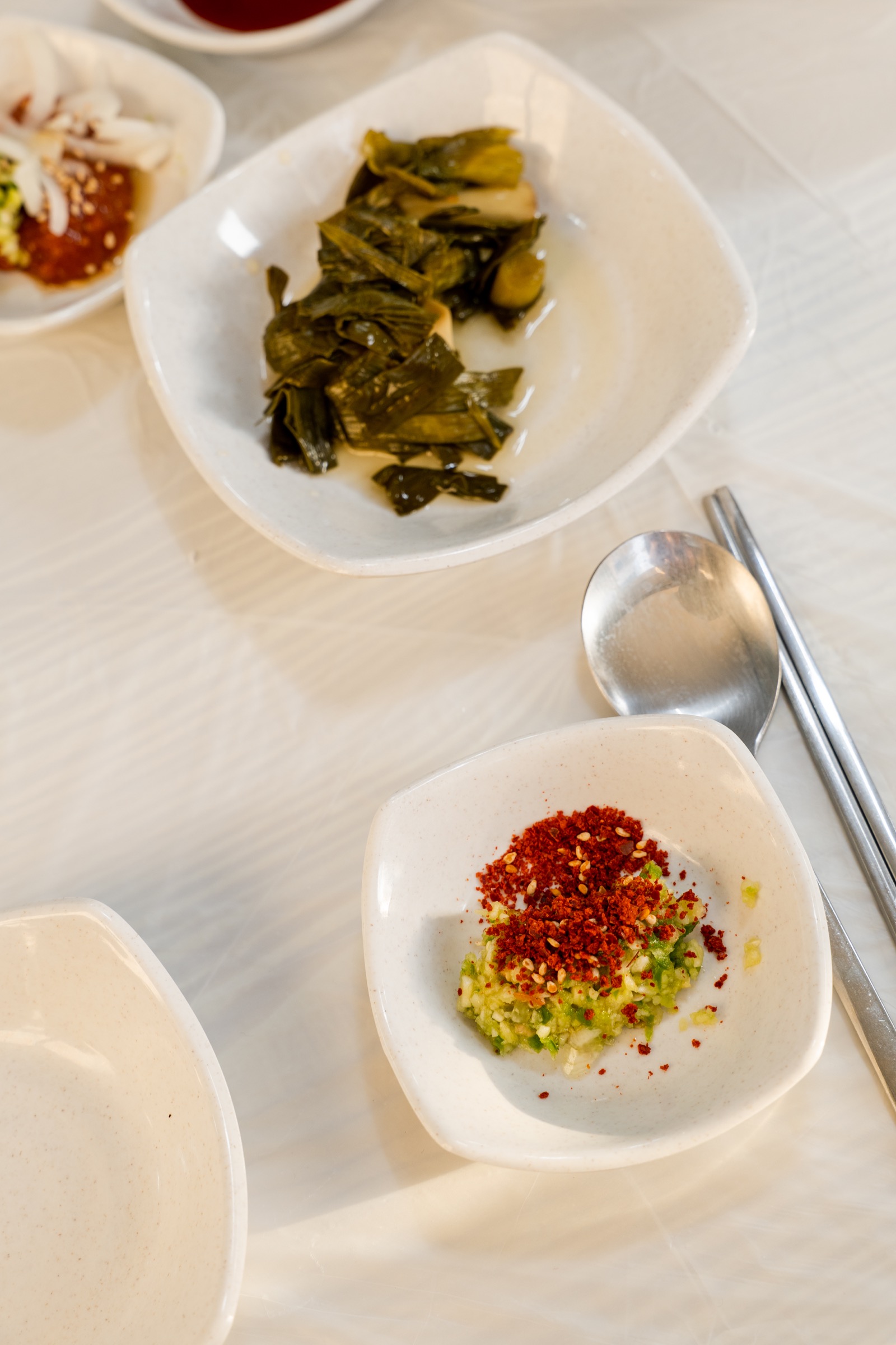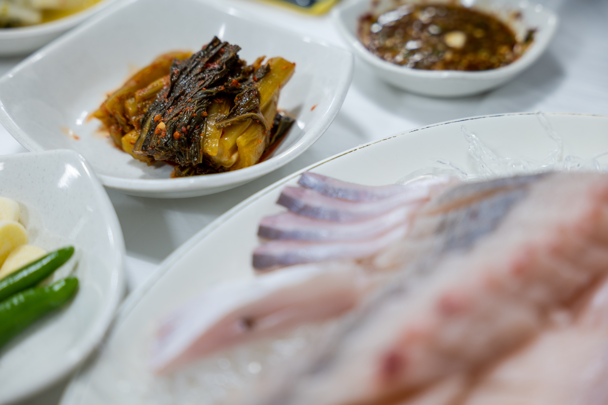 양념을 만드는 방법, 김에 삼치회와 갓김치, 양념, 초생강을 올려 한 입에 싸 먹는 방법 등. 거기에 공기밥을 주문하니 초밥 만들어 먹는 방법까지 설명해 주셨습니다. 위 사진은 다음날 방문햇을 때 찍은 것입니다. 첫 날 사장님 설명대로 한 점 먹고 나니 사진 찍을 생각도 못하고 정신없이 식사했거든요. 반찬들과 다양하게 조합해 먹는 즐거움이 대단했습니다. 거기에 여수 특산물인 갓김치의 알싸한 맛까지. 김치도 쌈장도 맛이 강해서 생선회와 먹기에는 적합하지 않을 수 있지만 삼치회는 그렇게 먹는 거랍니다.