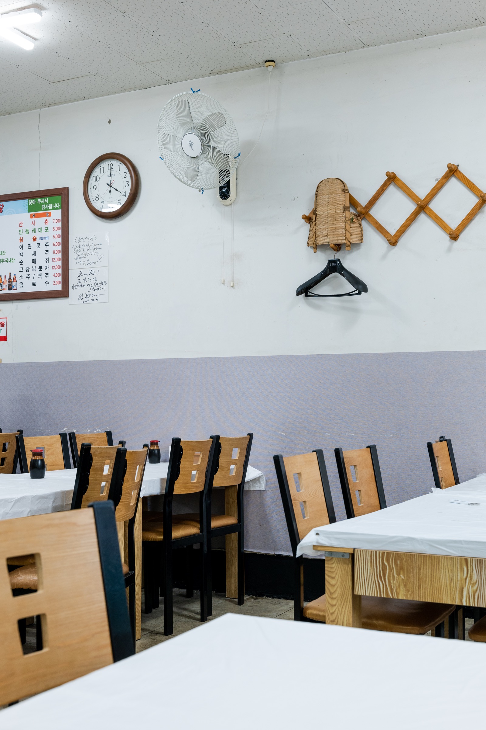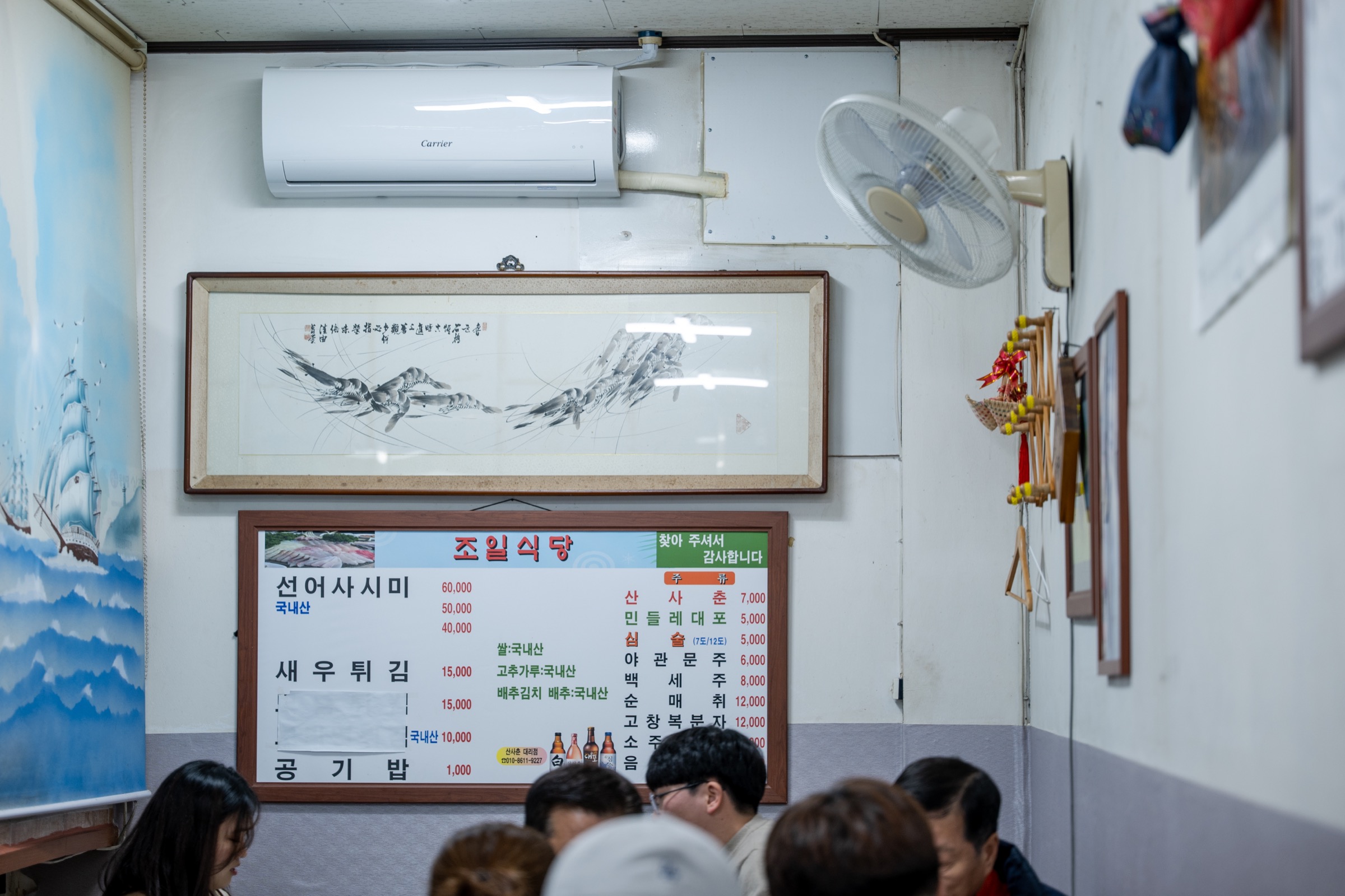 내부는 동네의 흔한 낡은 횟집 분위기입니다. 좁지 않은 실내에 테이블이 좁게 배치돼 있고, 테이블 위에 비닐을 겹겹이 씌워놓은 모양이 정겹습니다. 오후 다섯 시에 오픈하는데, 첫 날 일곱시쯤 갔더니 아슬아슬하게 한 자리가 남아 있어서 다음날엔 오픈 시간에 맞춰 갔습니다. 자리가 차면 한 시간 반에서 두 시간 정도 기다려야 한다더라고요.