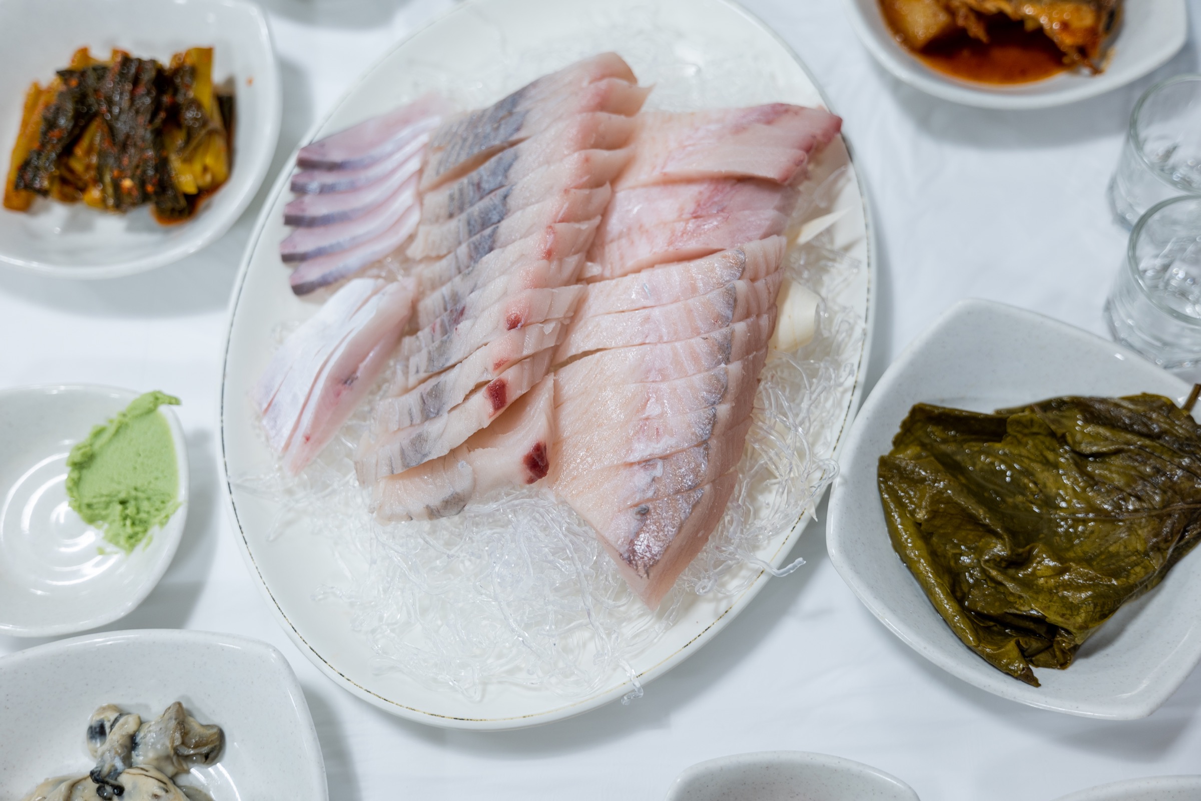 기대했던 삼치회. 그간 먹었던 다른 회와 비교할 수 없을 정도로 부드러웠고, 폭신한 식감이 잘 삶은 고기를 씹는 것 같았습니다. 담백하게 입 안에서 퍼지며 녹아내리는 맛이 다른 생선에서는 느낄 수 없는 맛이더라고요. 왜들 그렇게 이 계절을 기다려 삼치회를 먹는지 한 점으로 이해가 됐습니다. 사장님 말씀처럼 이 주에 한 번씩 온 가족이 인천에서 차를 타고 내려올 만 하다 싶었고요. 활어회가 생선살 고유의 맛과 식감을 즐기기 위해 곁가지를 최소화한다면, 삼치 선어회는 식감이 좋고 기름이 오른 생선살을 맛깔나는 반찬과 함께 푸짐하게 먹는 메뉴였습니다.
