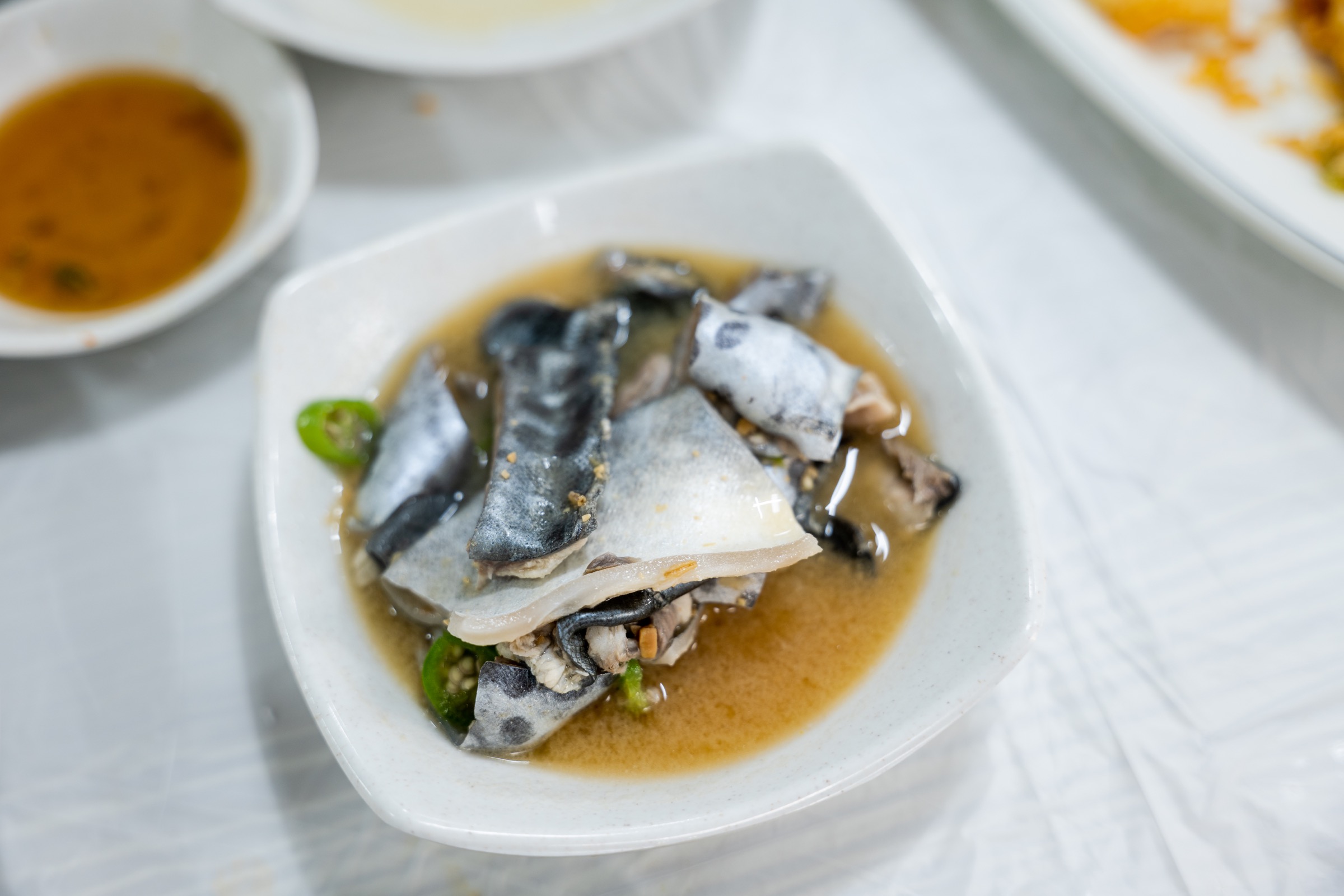 거기에 먹다 보면 이런저런 곁가지를 함께 내어 주십니다. 첫날은 생선 머리구이를 받았고, 둘째 날은 생선 껍질을 익힌 샤브샤브가 나왔습니다. 제가 술을 좋아했다면 이걸로 소주 한 병은 더 마셨을 것 같아요. 별로 좋아하지 않는데도 삼치회와 함께 한 병은 너끈히 마셨으니까요.
