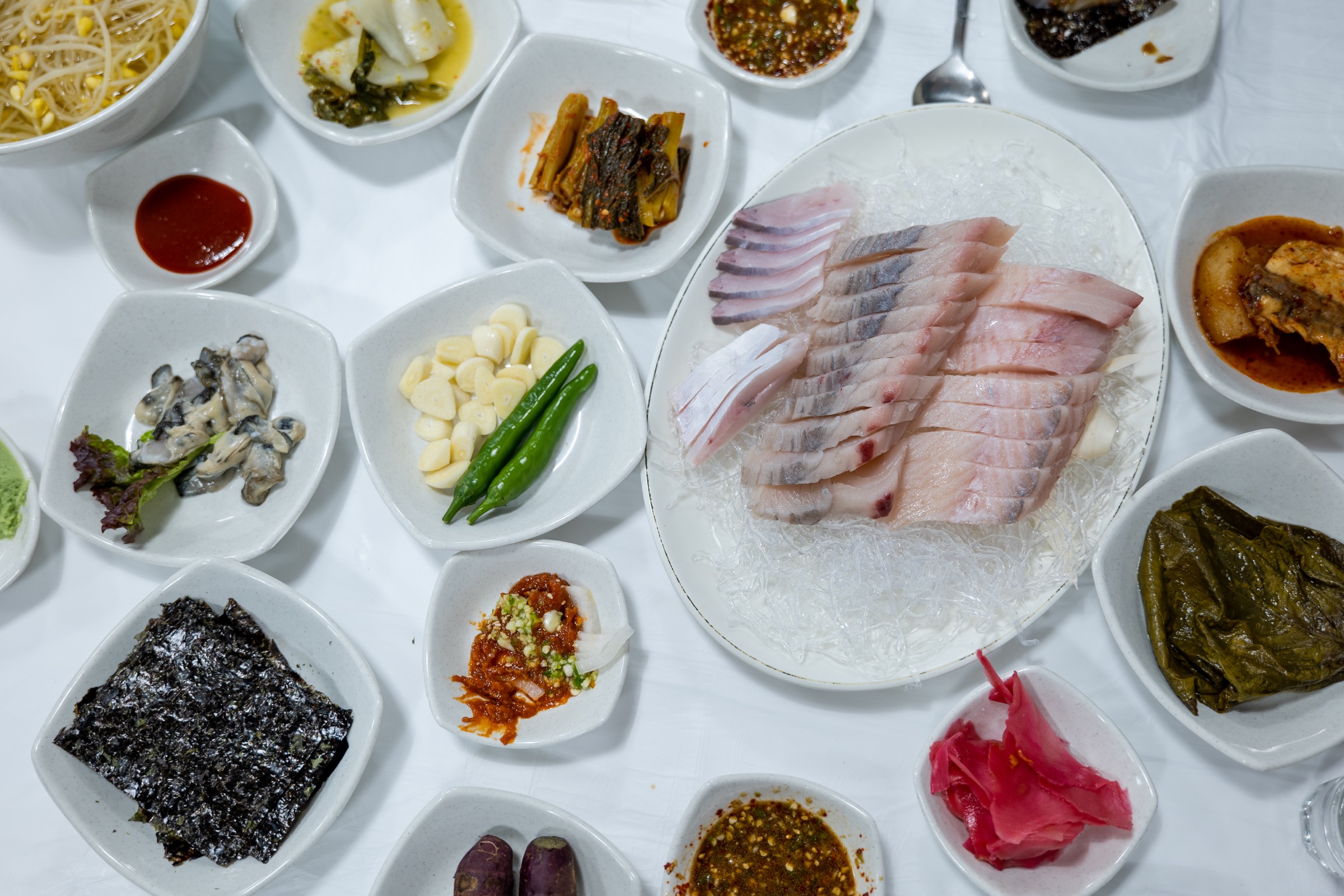 그렇게 차려진 남도 한 상. 두툼하게 썬 삼치회와 병어가 함께 나왔습니다. 4만원짜리 작은 사이즈인데 두 명 먹기에 충분한 양이었어요. 여수다보니 당연히 갓김치가 나오고 그 외에도 굴과 김치, 콩나물국, 깻잎, 고등어 조림 등의 반찬들 그리고 고구마같은 주전부리도 나오는 푸짐한 한 상이었어요. 특히 곁다리로 나오는 고등어 조림 맛이 좋아서 못 참고 공기밥을 주문했습니다.