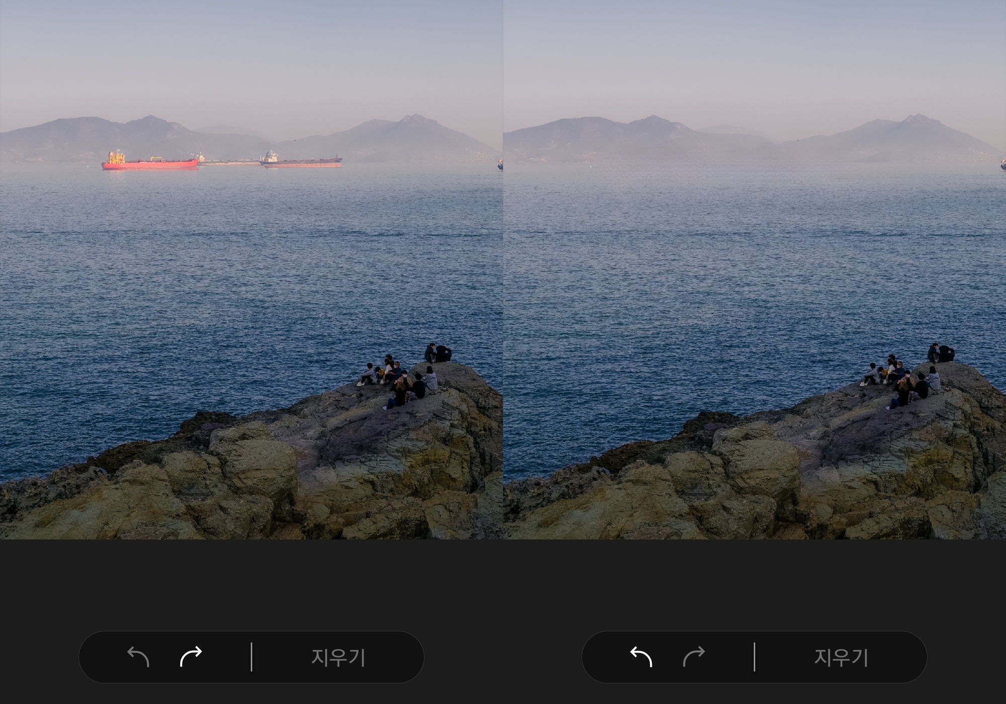 사용자가 지우고자 하는 개체를 손으로 직접 터치해 선택하게 됩니다. 비슷한 형태와 색상을 가진 영역을 컴퓨터가 선택해 표시합니다. 이 과정은 전문 사진 편집 프로그램처럼 쾌적합니다. 여러개의 개체를 선택할 수도 있고요. 그 뒤 화면에 표시된 '지우기' 버튼을 터치하면 해당 개체가 지워지면서 주변 풍경/패턴이 빈 자리에 채워집니다.