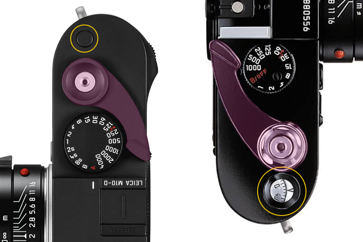 상단에선 필름 카메라의 와인딩 레버에서 차용해 온 엄지 그립이 돋보입니다. M10-D의 루머가 있을 때부터 출시 직후까지 저 레버가 담당하게 될 기능이 무엇인지 많은 사람들이 궁금해 했죠. 아무 기능 없이 그저 필름 카메라의 그것을 오마주 한 엄지 그립이라는 것에 대부분이 실망했지만, 실제 사용자들은 이것이 M10-D의 아날로그 감성을 완성하는 데 중요한 요소이면서 동시에 안정적인 파지를 가능하게 하는 본래의 목적을 매우 잘 수행한다고 평하고 있습니다.