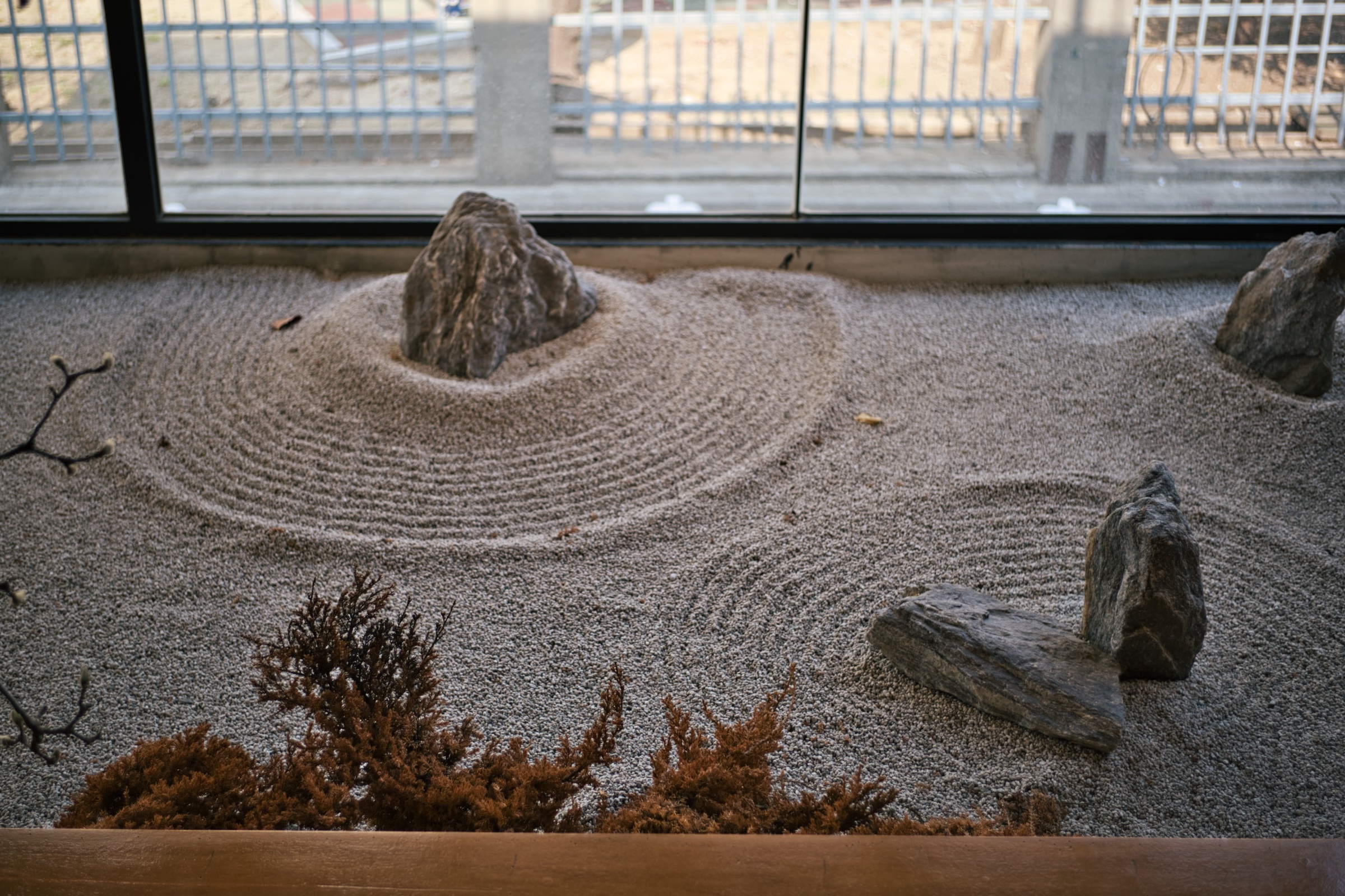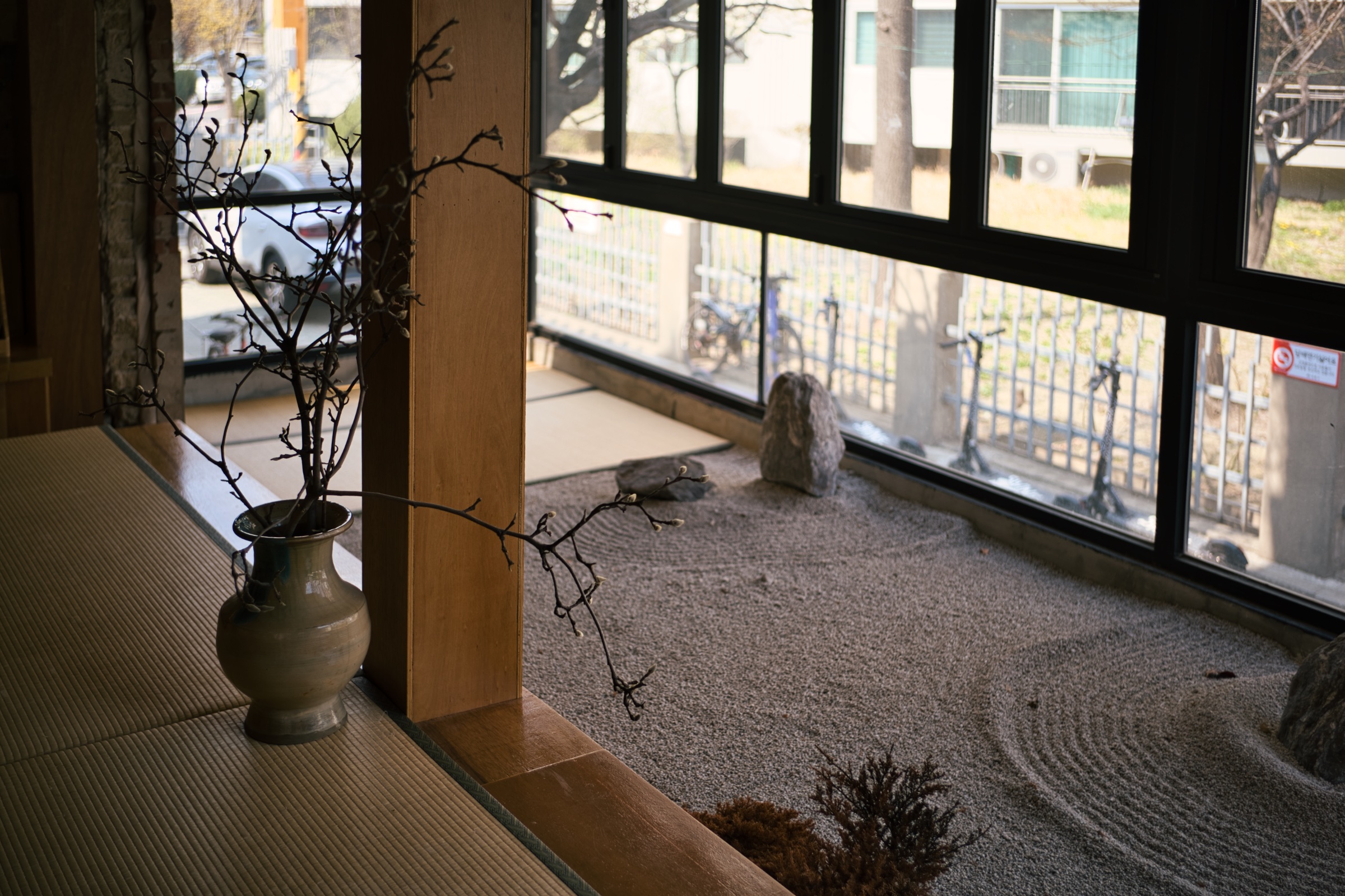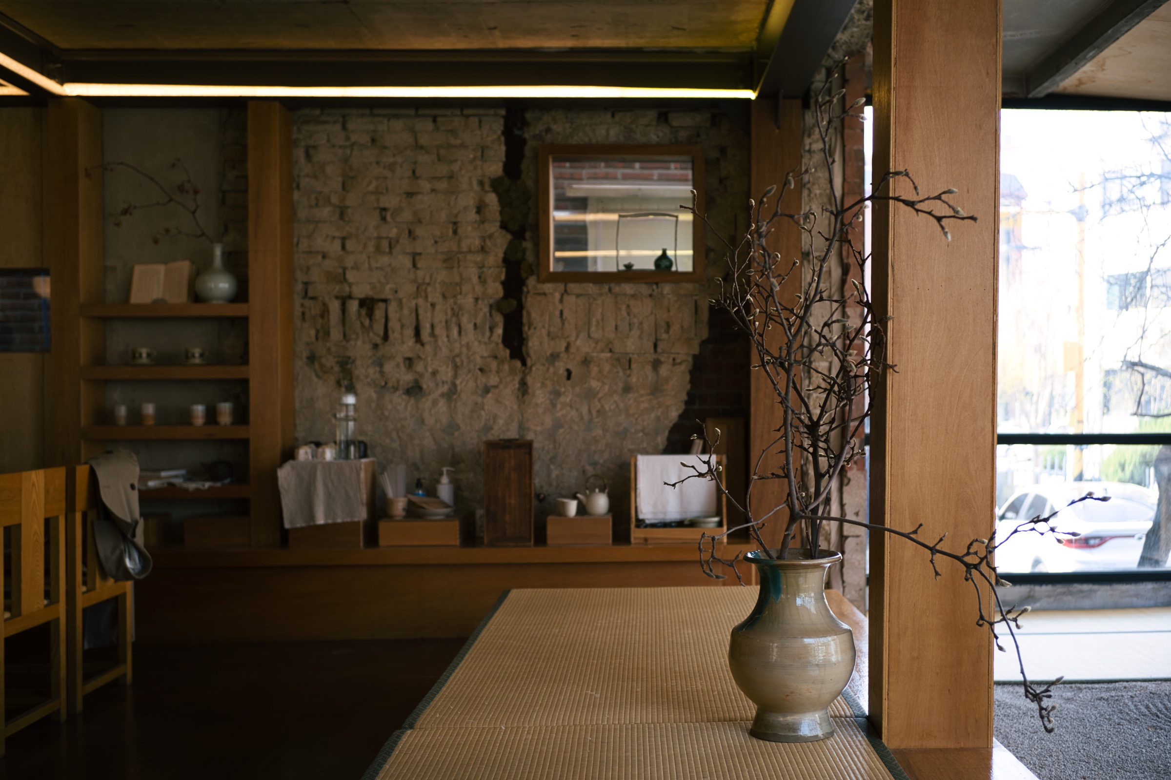 평범한 2층 상가 내부를 독특한 분위기의 카페로 잘 꾸민 것 같습니다. 거기에 도자기나 차 덖는 기구, 부채, 책상과 의자 등 가구와 소품들이 마음에 들었어요. 가장 보기 좋았던 건 창가에 꾸며진 작은 자갈 마당. 일본식 카페의 정원을 떠올리게 하는 모양새인데, 창 너머 풍경은 복작복작해도 돌과 모래를 보고 있으면 맘이 차분해지긴 합니다.