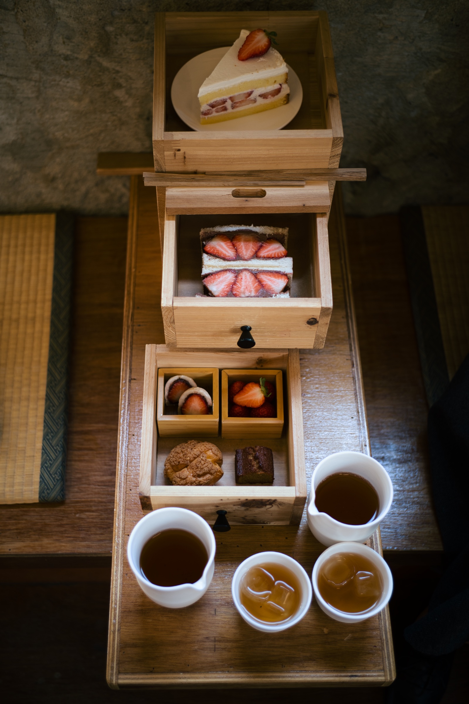 디저트 박스는 위 사진처럼 배달(?)됩니다. 가장 위에 케이크가 있고 아래 서랍을 열면 두 접시의 디저트가 더 있습니다.