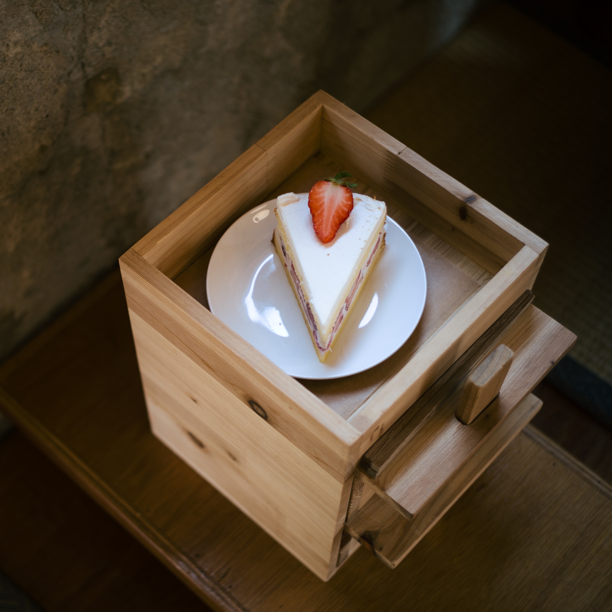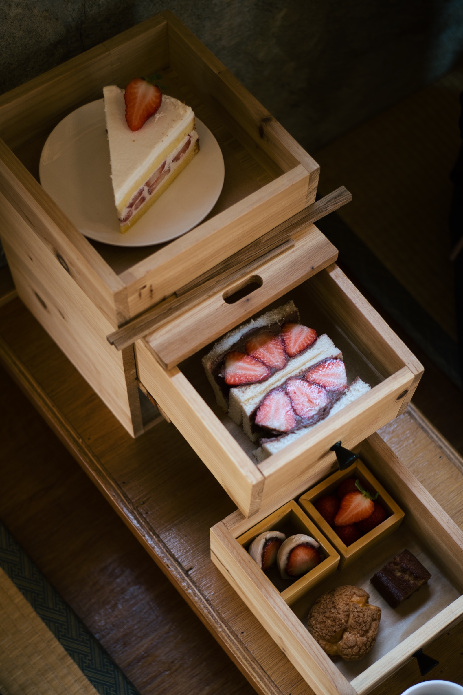 디저트를 먹는 젓가락도 나무로 되어 있을만큼 박스라는 컨셉에 충실했습니다. 나무 젓가락에 호지차까지 곁들이니 전통찻집에서 현대식 디저트 먹는 느낌이 나더라고요. 딸기 신선도는 우려했던 것보다 좋았습니다. 다녀가신 분들이 가격과 양에 대해 아쉬워하셨는데, 가격이 높은 건 사실이지만 주재료인 딸기 품질은 괜찮았습니다.