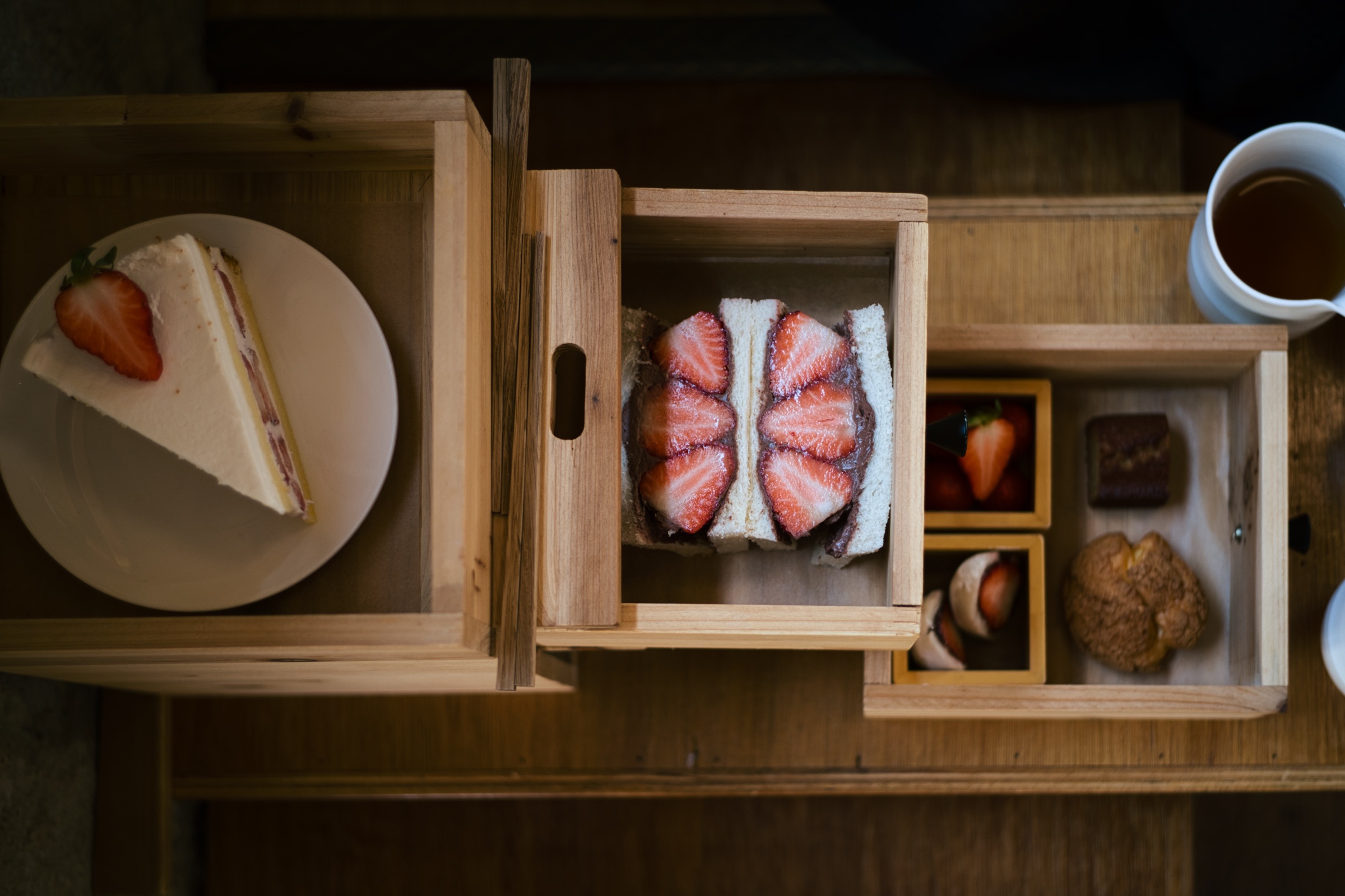 가장 만족했던 아래층 디저트들. 혹 이렇게 한 접시만 따로 구성해 판매하면 차와 함께 주문하고 싶은 마음이 들 정도로 종류나 각 디저트의 개성 모두 괜찮았어요. 이상하게 따로 돈 내고 사먹지 않게 되는 딸기 모찌도 한 입 먹기에는 괜찮았고, 팥이 함께 든 것도 좋았습니다. 딸기 크림 소보루는 크림의 향이 좋았고 파운드 케이크 역시 딸기 향과 고소한 맛이 잘 어울렸어요.