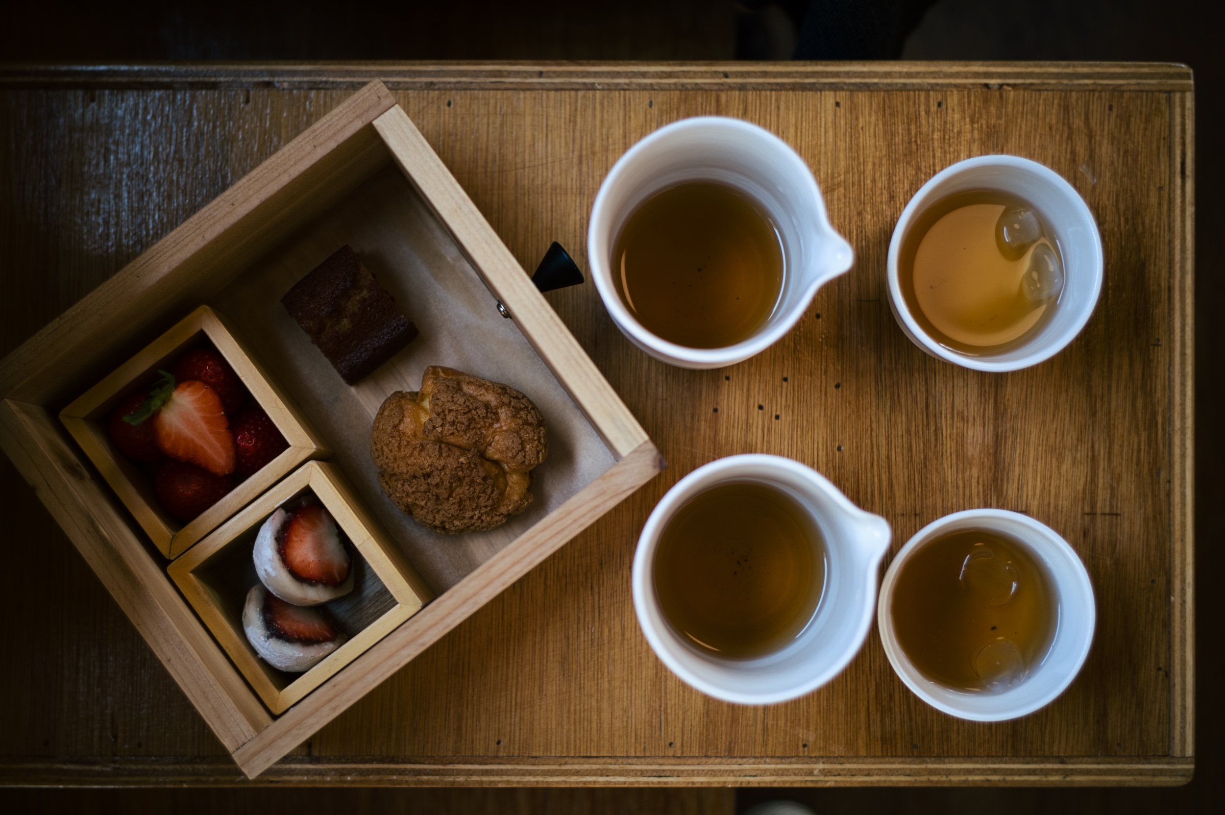 디저트를 먹는 젓가락도 나무로 되어 있을만큼 박스라는 컨셉에 충실했습니다. 나무 젓가락에 호지차까지 곁들이니 전통찻집에서 현대식 디저트 먹는 느낌이 나더라고요. 딸기 신선도는 우려했던 것보다 좋았습니다. 다녀가신 분들이 가격과 양에 대해 아쉬워하셨는데, 가격이 높은 건 사실이지만 주재료인 딸기 품질은 괜찮았습니다.