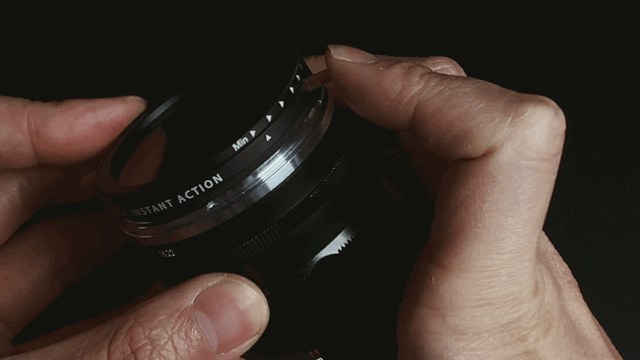 결합에서 독특한 자석 부착 방식이 사용될 뿐 기본적인 사용 방법은 일반적인 가변 ND 필터와 같습니다. 두 개의 프레임이 겹쳐져 있는 형태로 프레임을 돌려 수치를 조절하게 됩니다. 아랫쪽 메인 프레임의 화살표에 맞춰 위쪽 프레임을 돌리면 Min 값부터 Max 값까지 수치가 적용되는 방식. 효과는 뷰파인더 또는 디스플레이를 통해 즉시 반영됩니다.