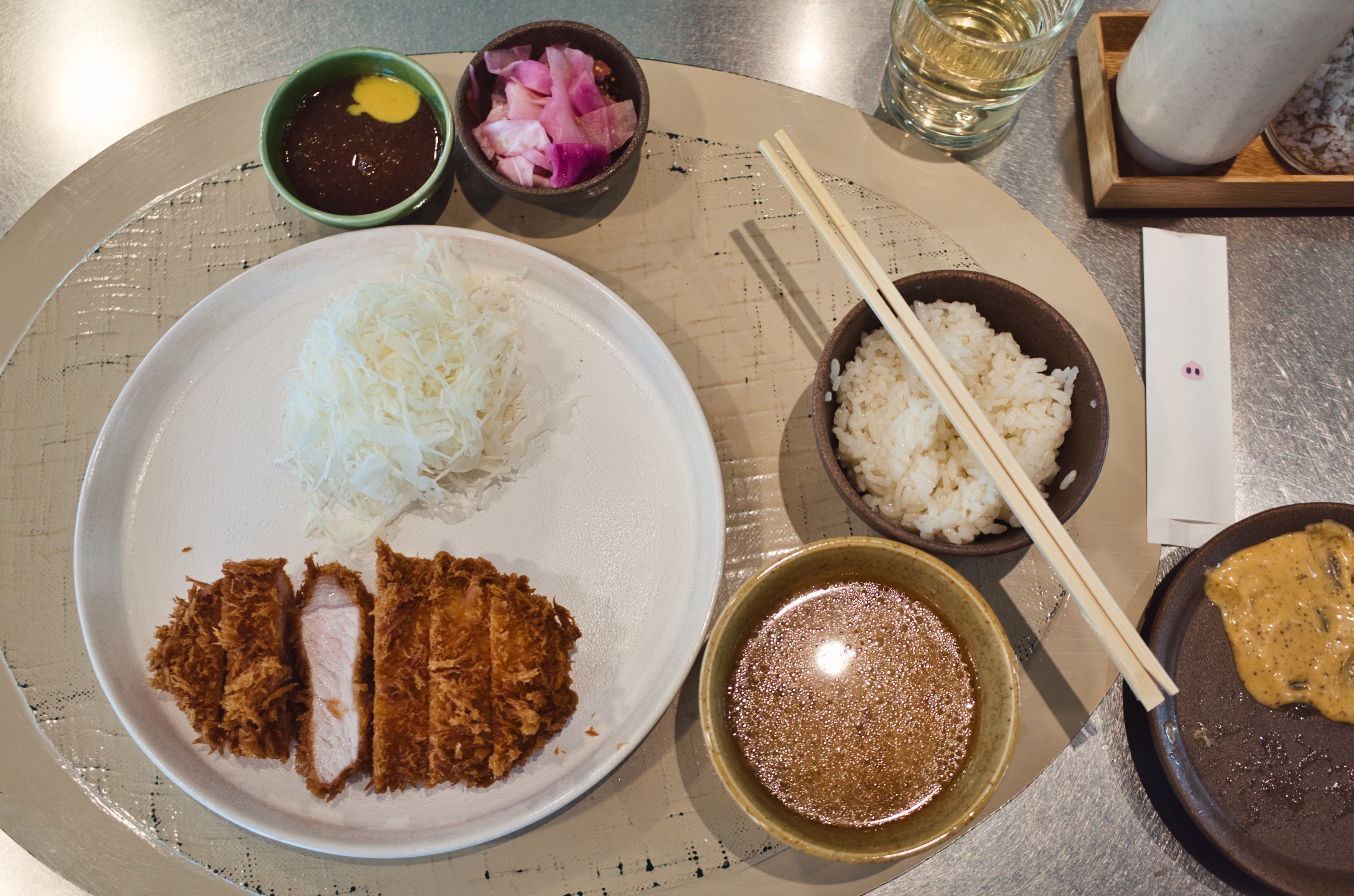 기본 상차림. 메뉴는 등심, 안심, 믹스 카츠가 있고 거기에 밥과 된장국을 추가한 정식이 있습니다. 그 외에 사이드 메뉴와 주류 등도 있고요. 메뉴에 맞게 젓가락 포장지에 돼지코를 새겨 넣은 것이 재미있습니다.
