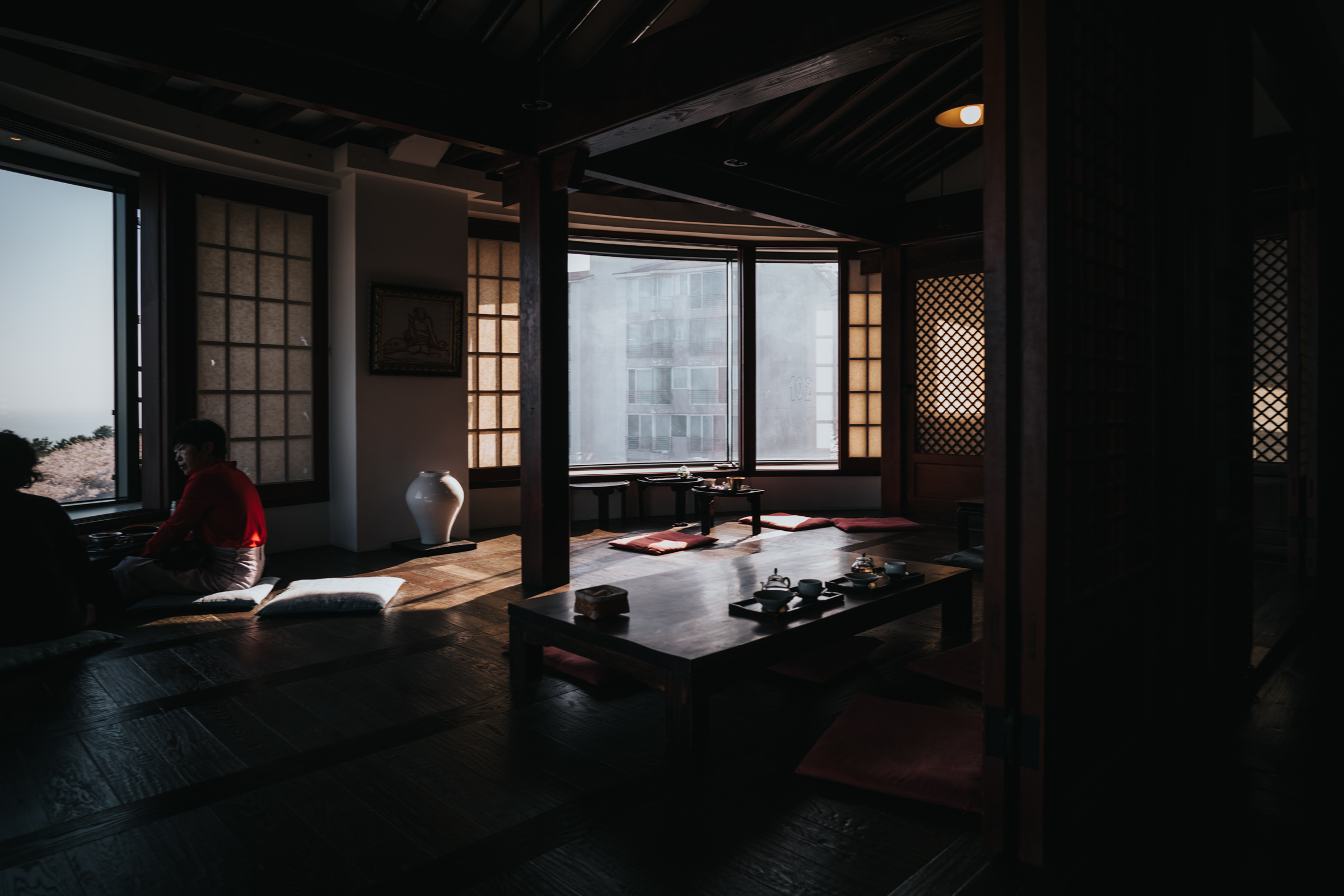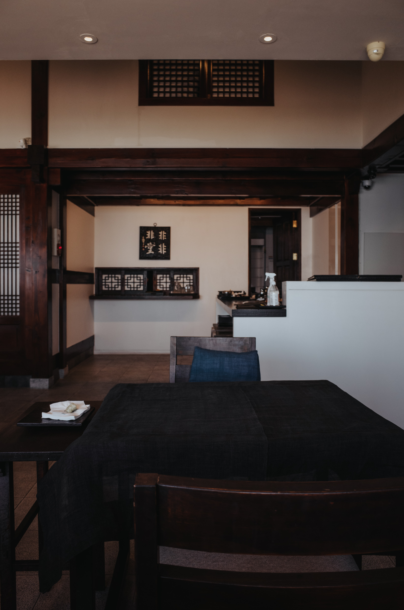 들어서니 커다란 창 밖으로 보이는 풍경이 인상적입니다. 벽면을 따라 창을 크게 내서 차와 함께 바깥 풍경을 감상할 수 있도록 했습니다. 입식과 좌식 테이블이 모두 있고 내부 인테리어는 한옥의 그것을 많이 닮았습니다.