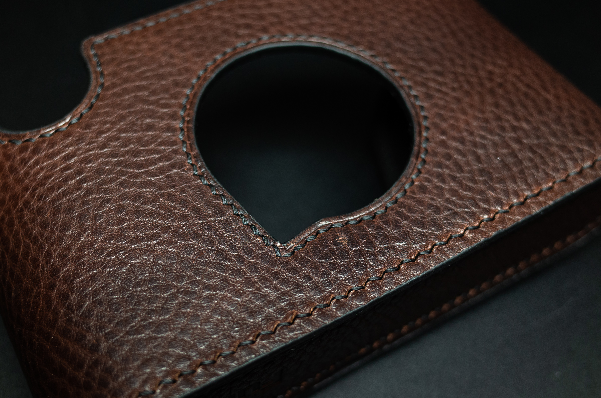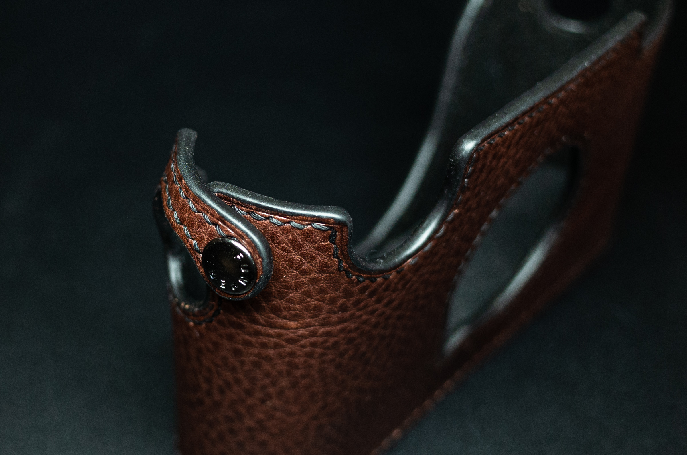 M10-D의 디자인에 맞게 뒷면 대부분을 가죽으로 덮고 전원 스위치 부분만 원형으로 뚫어 놓은 것이 특징입니다. 천연 소가죽을 사용했고 앞쪽에 돌출된 그립을 대 그립을 향상시켰습니다. 컬러는 블랙과 브라운 두 가지가 있습니다. 무난한 것은 블랙이지만 저는 평소 취향에 따라 브라운 컬러를 구매했습니다.