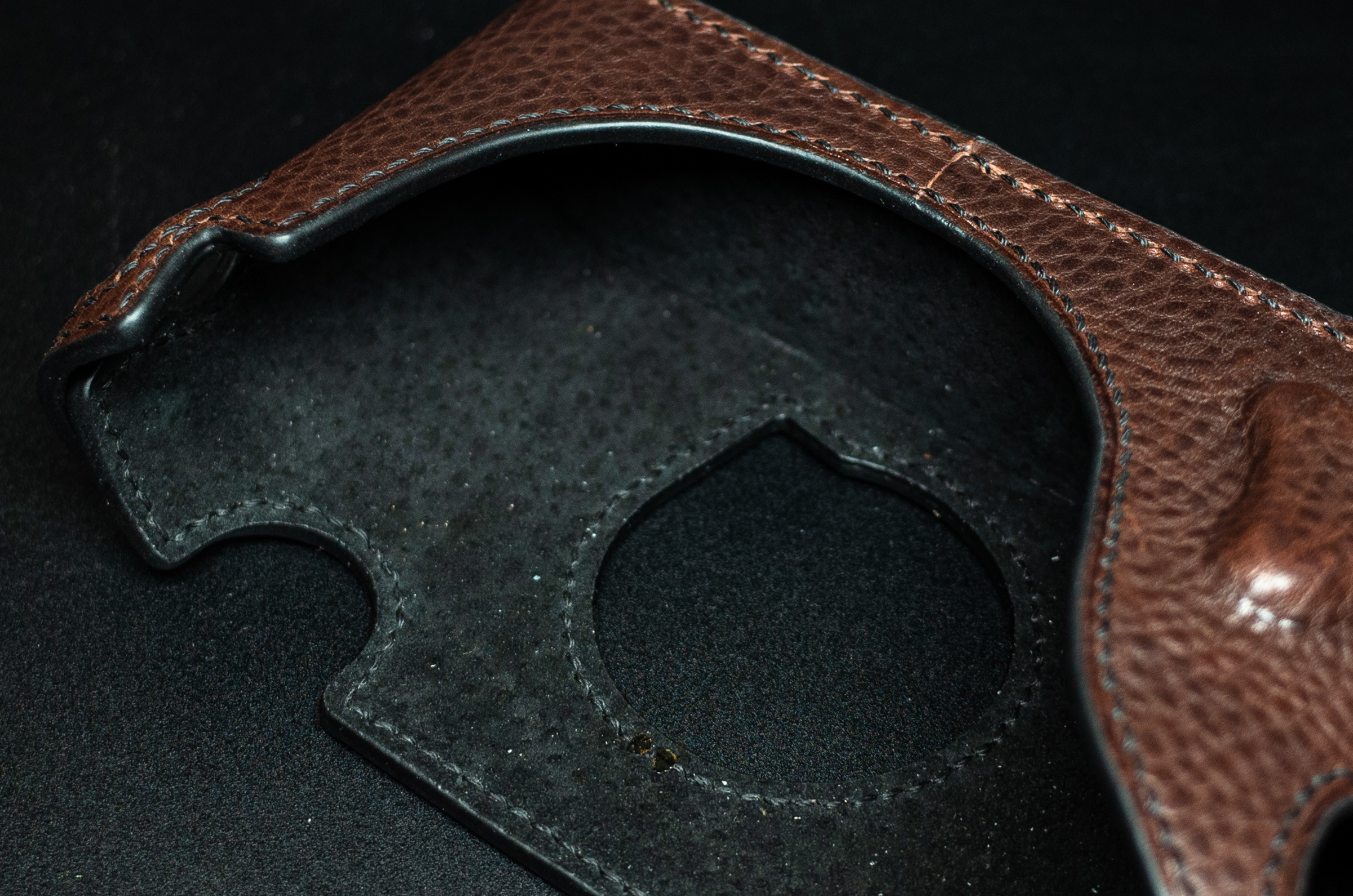 뒤를 보면 확실해지죠. 케이스와 카메라의 밀착도는 꽤 좋은 편입니다. 뒷면이 뜨지 않고 딱 맞아서 손에 쥘 때 안정적이에요. 뷰파인더와 오른쪽 다이얼 돌출부에 맞춰 재단도 잘 돼있고, 중앙 홈은 다이얼 크기보다 약간 크게 디자인됐습니다. 다이얼을 돌리기 편하게 해 놓은 곳으로 보이는데, 보기에 엉성할 정도는 아닙니다. 왼쪽 아래 공간은 손가락을 넣어 조작하기 좋게 낸 공간으로 보입니다.