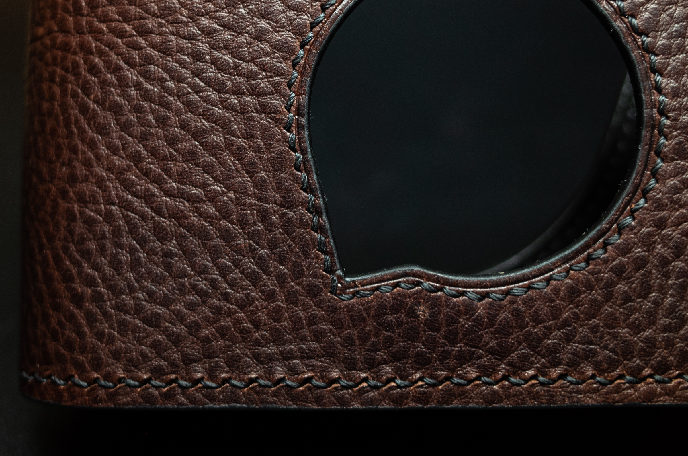 케이스의 핵심인 뒷면 전원 다이얼 부분만 원형으로 공간을 남겨뒀습니다. 홈 주변으로도 박음질을 하고 엣지 마감도 한 것이 만족스러워요.
