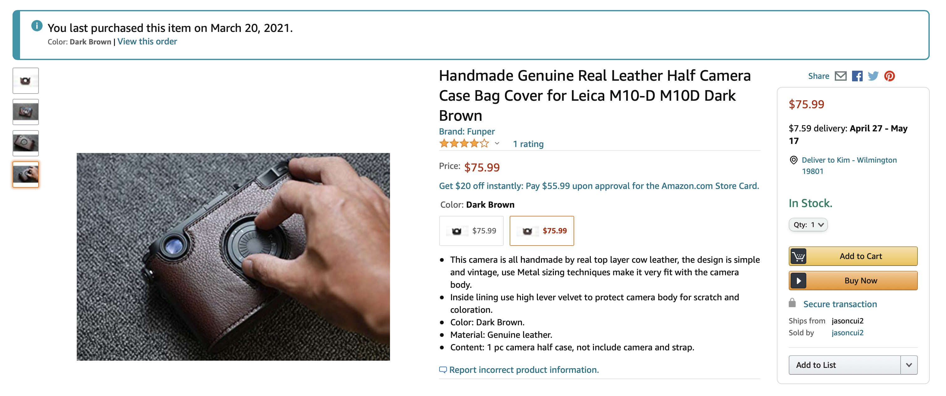 그러다 찾은 것이 Funper라는 브랜드의 M10-D 전용 하프 케이스. 아마존과 이베이 등에 팔고 있는 곳으로 라이카 카메라를 비롯해 몇몇 브랜드의 카메라용 가죽 하프 케이스를 판매하고 있습니다. 규모나 라인업이 그리 크지 않은데도 라이카 M10-D 전용 케이스를 판매하는 것이 고맙더라고요. 가격도 76달러로 비교했던 제품 대비 훨씬 저렴합니다. 망설임 없이 구매했습니다.