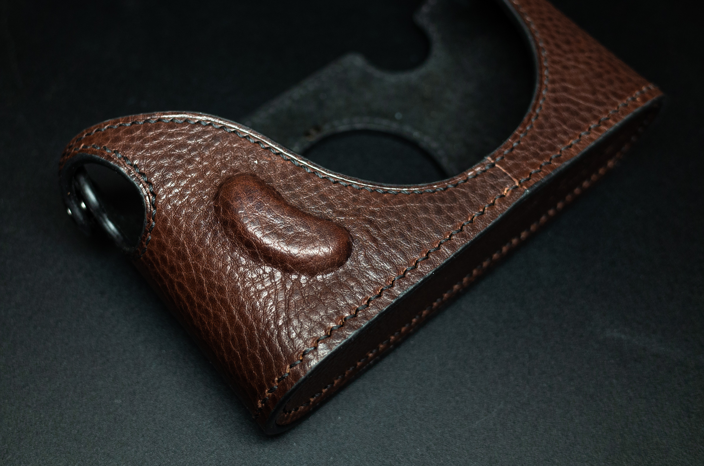 M10-D의 디자인에 맞게 뒷면 대부분을 가죽으로 덮고 전원 스위치 부분만 원형으로 뚫어 놓은 것이 특징입니다. 천연 소가죽을 사용했고 앞쪽에 돌출된 그립을 대 그립을 향상시켰습니다. 컬러는 블랙과 브라운 두 가지가 있습니다. 무난한 것은 블랙이지만 저는 평소 취향에 따라 브라운 컬러를 구매했습니다.