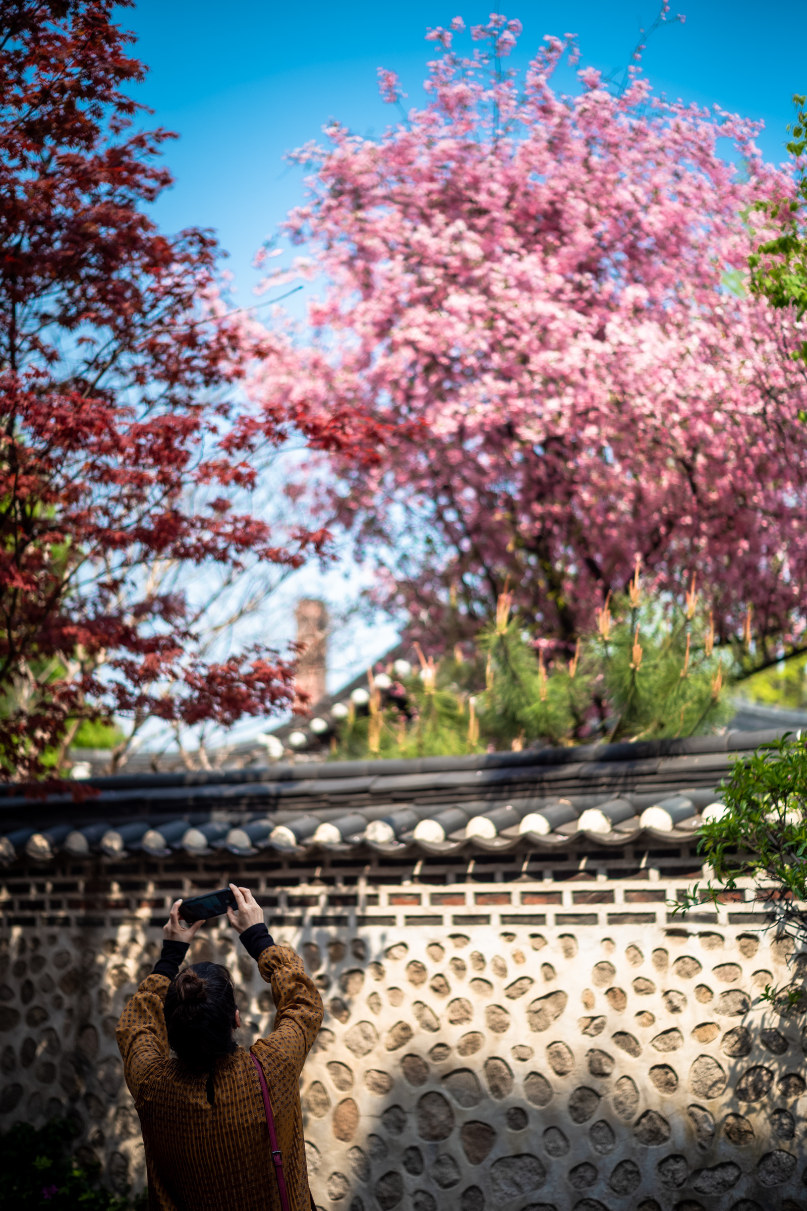 삼청동 입구에서 본 풍경. 사람들이 몰려있어서 구경거리가 있나 다가갔더니 활짝 핀 벚꽃 나무 앞에서 저마다의 봄을 기록하기에 여념이 없더라고요. 마침 구름이 나무들 사이에 예쁘게 걸려 있어 기분 좋게 사진에 담았습니다.
