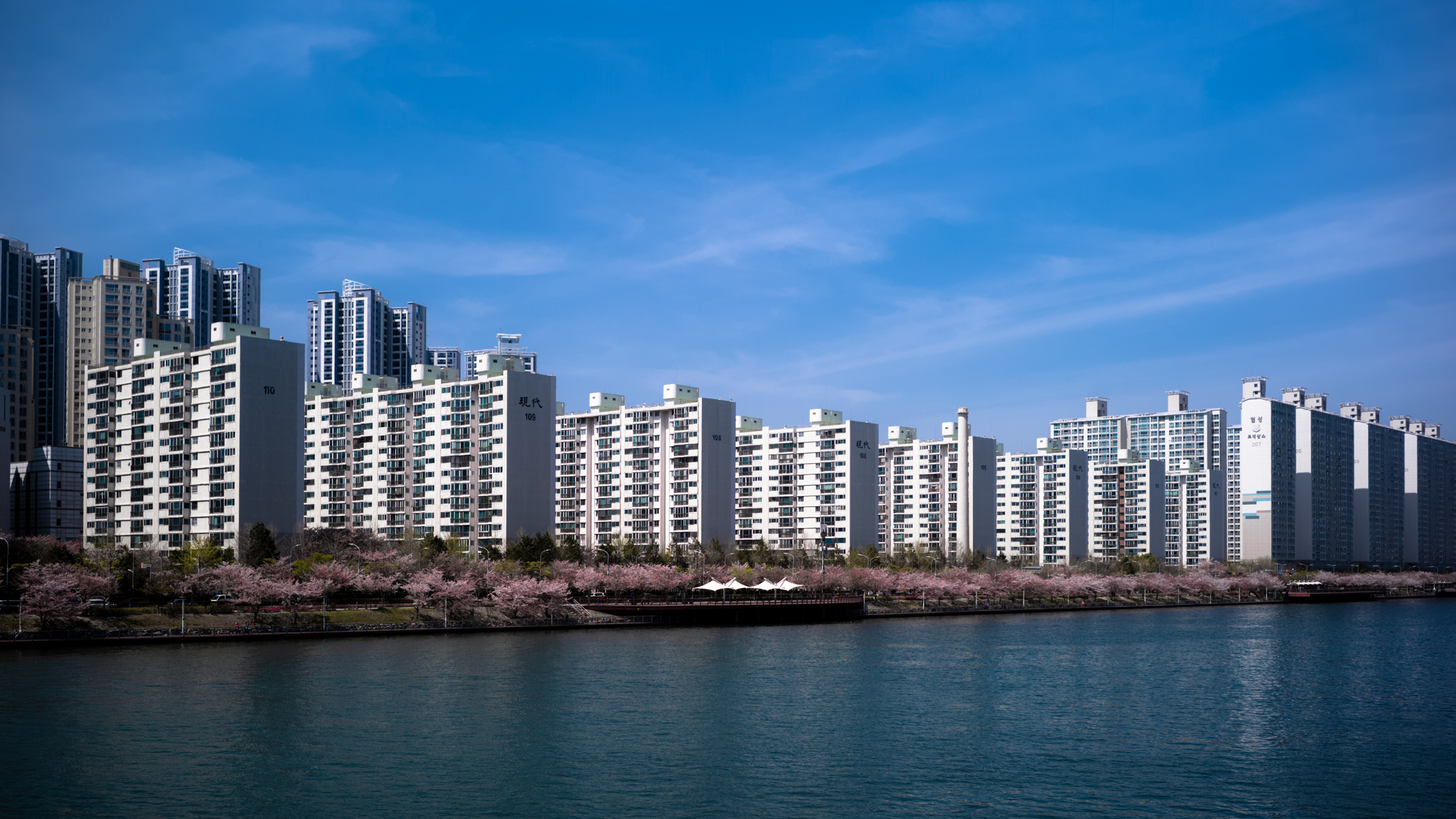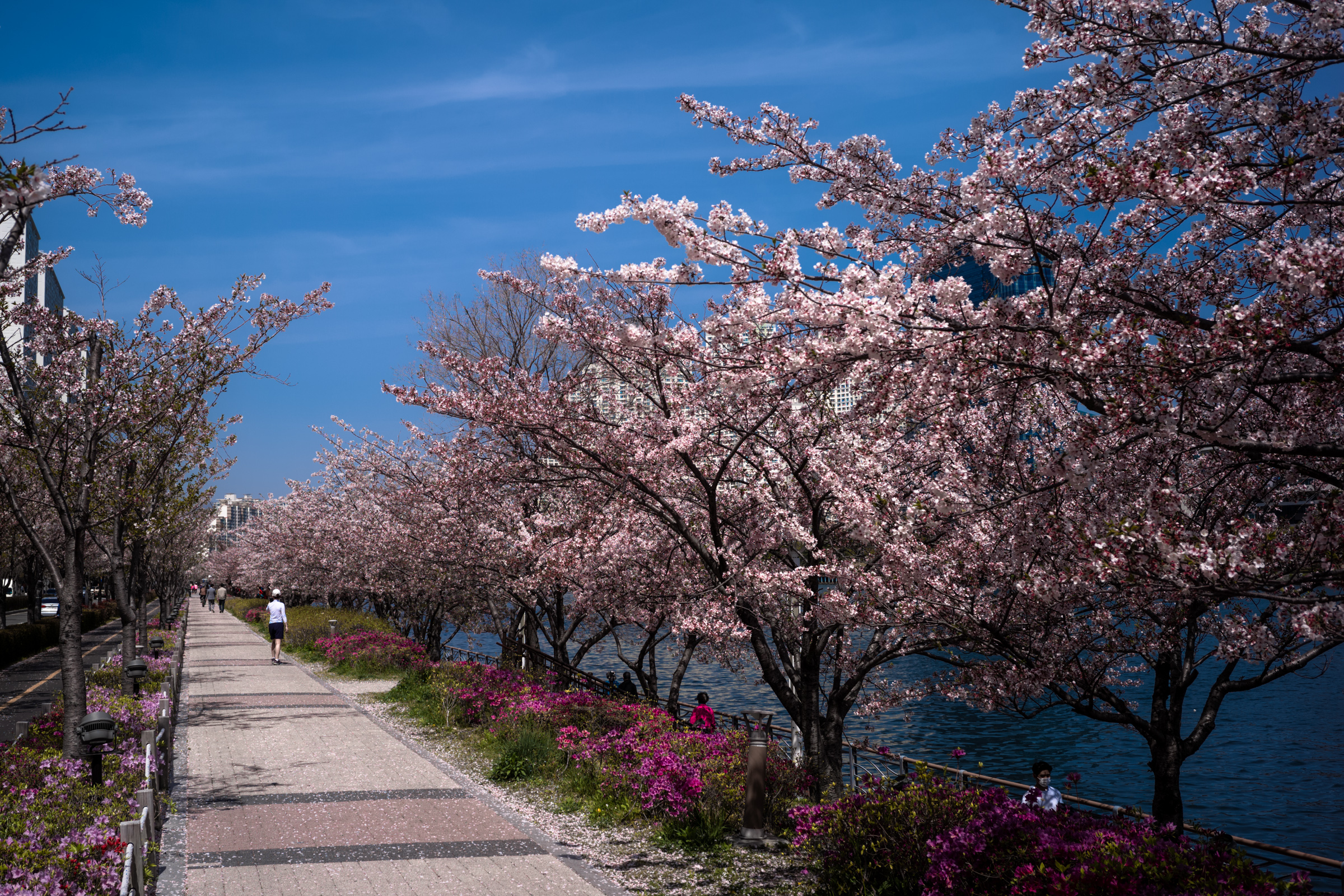 부산에 도착해 숙소로 이동하며 센텀시티를 흐르는 수영강 양쪽으로 조성된 공원과 산책로에 가득한 벚꽃에 마음을 빼앗겼습니다.