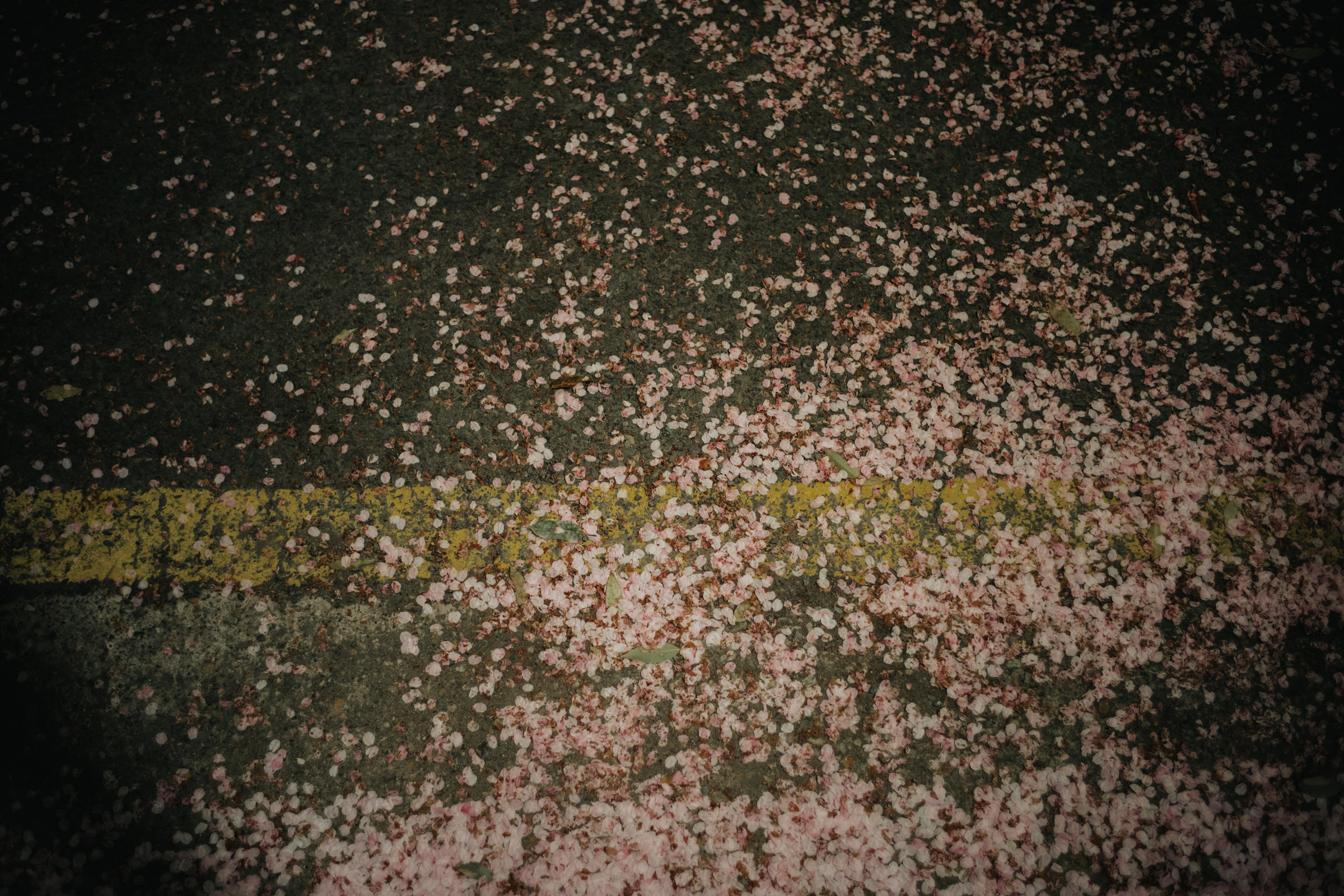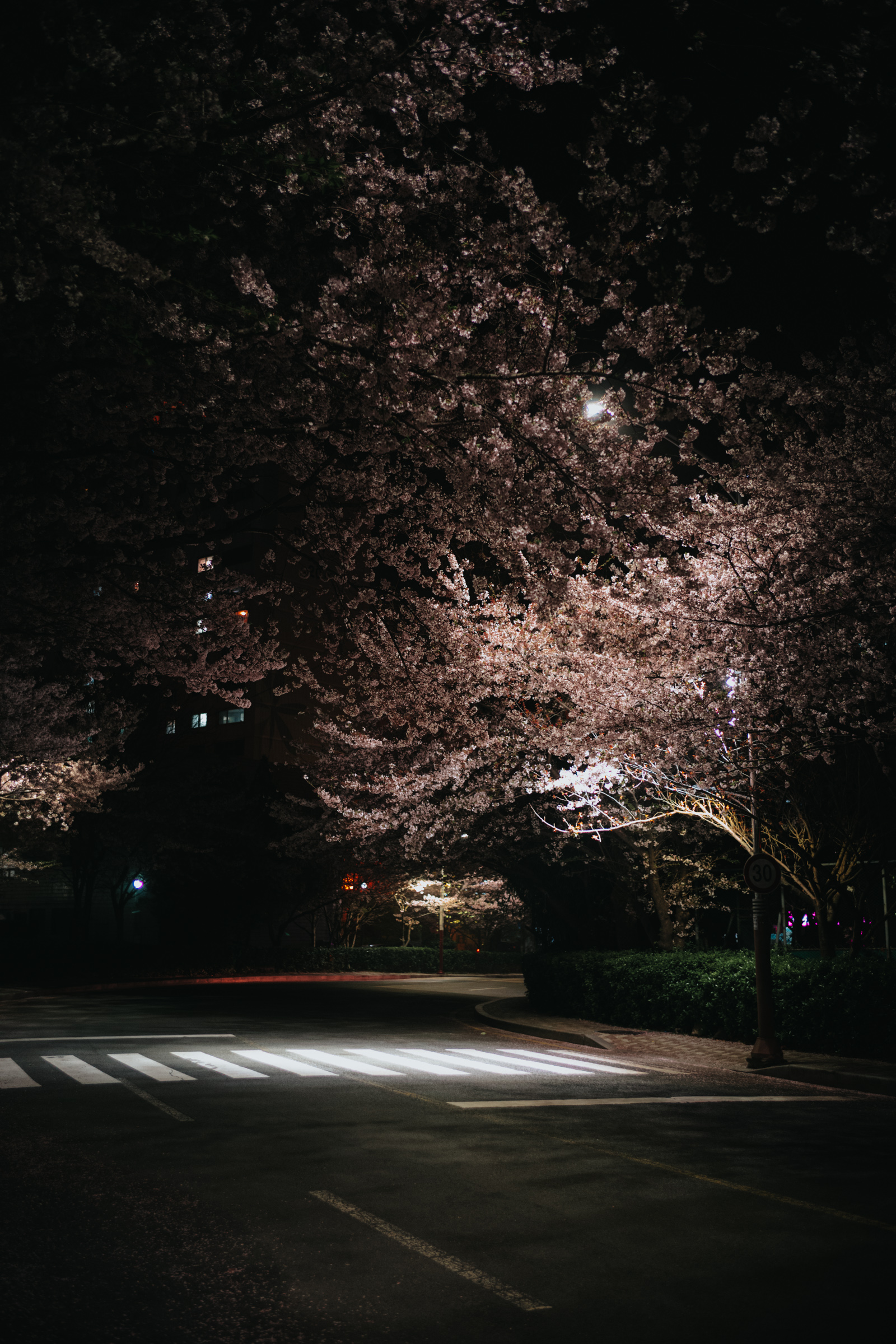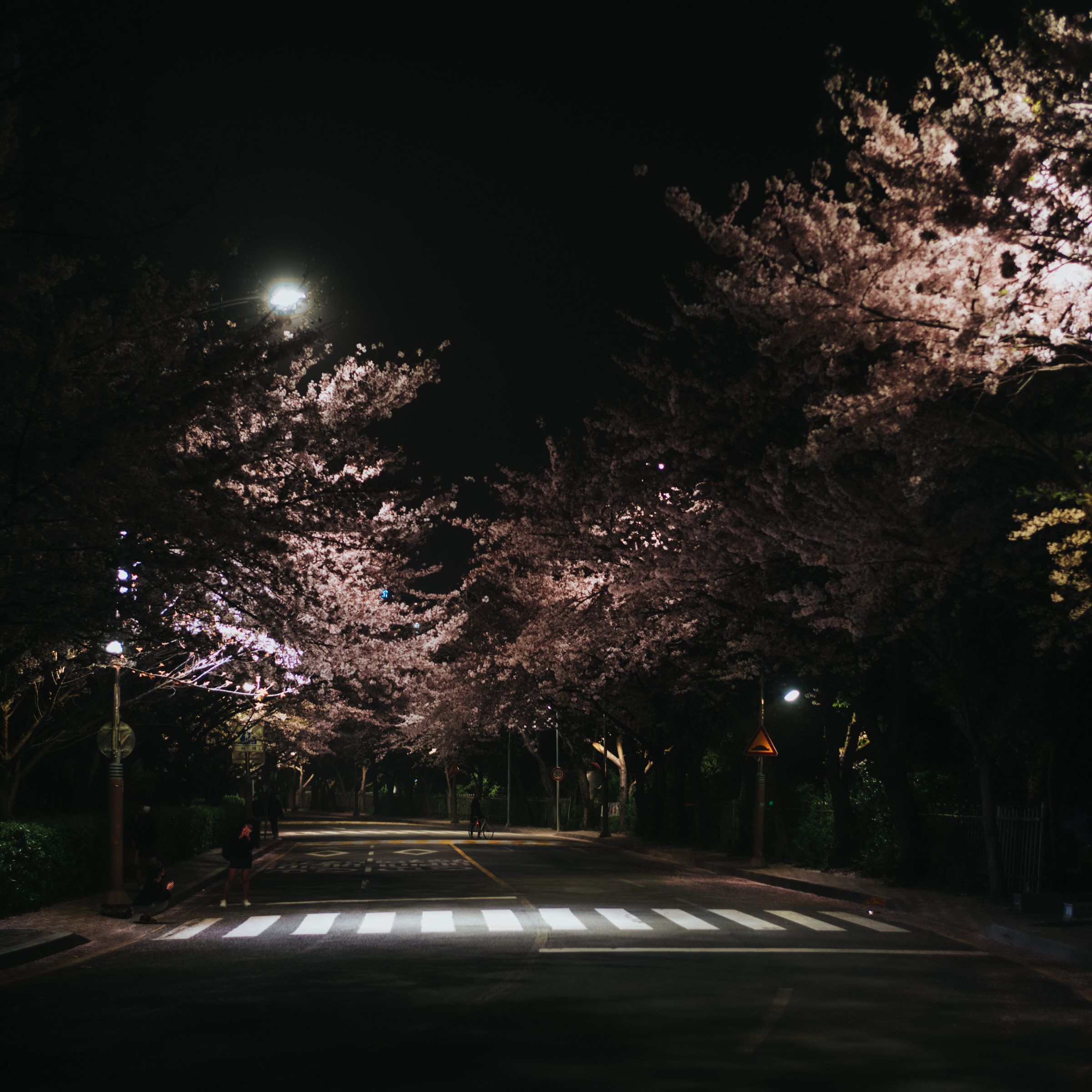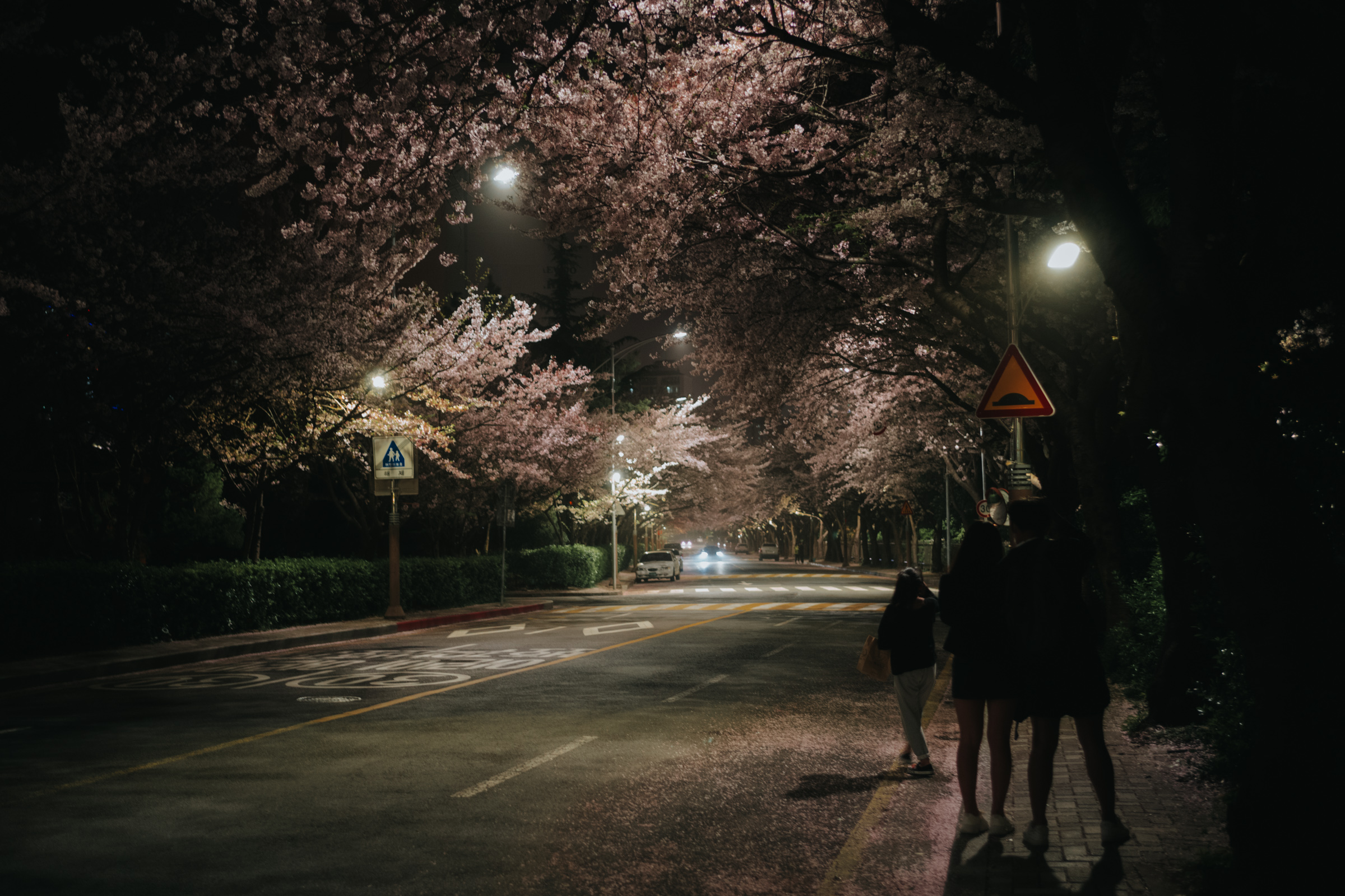 평소엔 눈길을 주지 않던 가로등 등불마저 횡단보도와 꽃잎을 멋진 실루엣으로 그리고 있었고요.