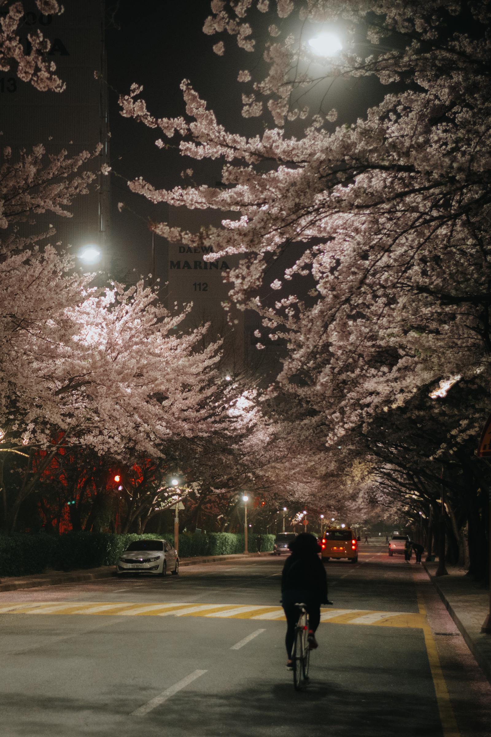 숙소가 있는 동백역 버스정류장에 내려 걸어 들어오는 길, 아파트 단지 사이사이를 가득 채운 밤 벚꽃 풍경에 이끌려 들어갔고 삼삼오오 모인 사람들 뒤로 펼쳐진 풍경에 시간을 잊고 한참을 머물렀습니다. 찾아보니 대우 마리나 아파트 단지더군요.