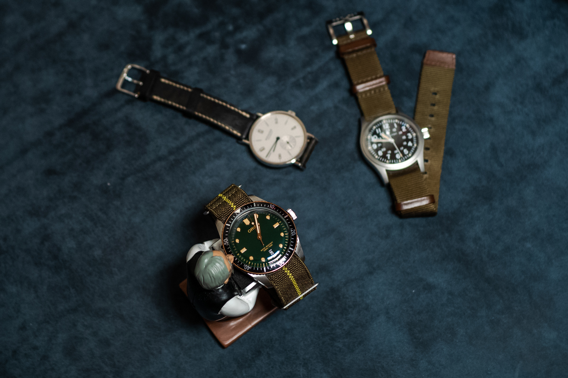 제가 가지고 있는 그린 다이얼/브론즈 베젤 모델 기준으로 오리스 정품 스트랩은 스틸,레더,러버 세 가지가 있습니다. 세 가지를 모두 구입했지만 결국 셋 다 방출하고 현재는 나토 스트랩과 스웨이드 스트랩을 사용하고 있습니다. 각각 장단점과 불만이 있는데, 이건 지난 포스팅에 상세히 설명해 두었습니다. 요약하자면 러버 스트랩은 착용감은 좋지만 시계 디자인과 어울리지 않았고, 스틸 브레이슬릿은 무겁고 착용감이 좋지 않았습니다. 가죽 스트랩은 디자인은 만족스러웠지만 가죽이 두꺼워서 시중에서 구매할 수 있는 가죽 스트랩에 비해 착용감이 떨어졌습니다.